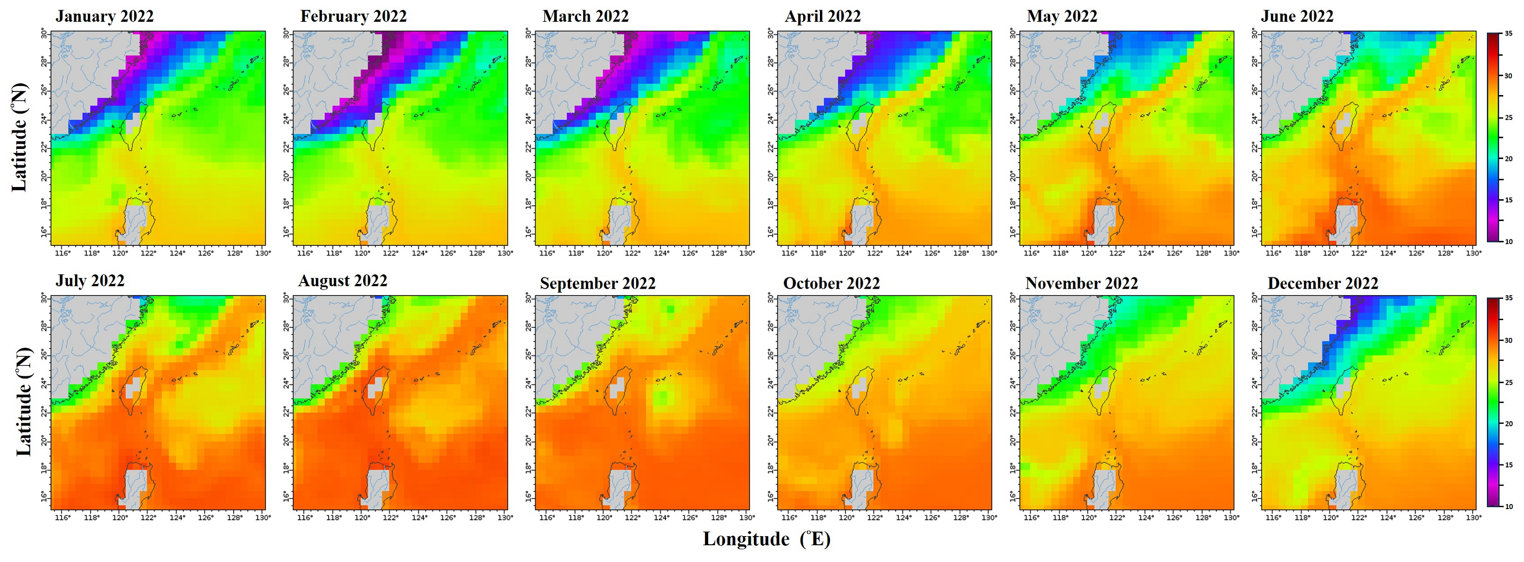 Monthly mean sea surface temperature in the northwestern Pacific from January to December 2022.