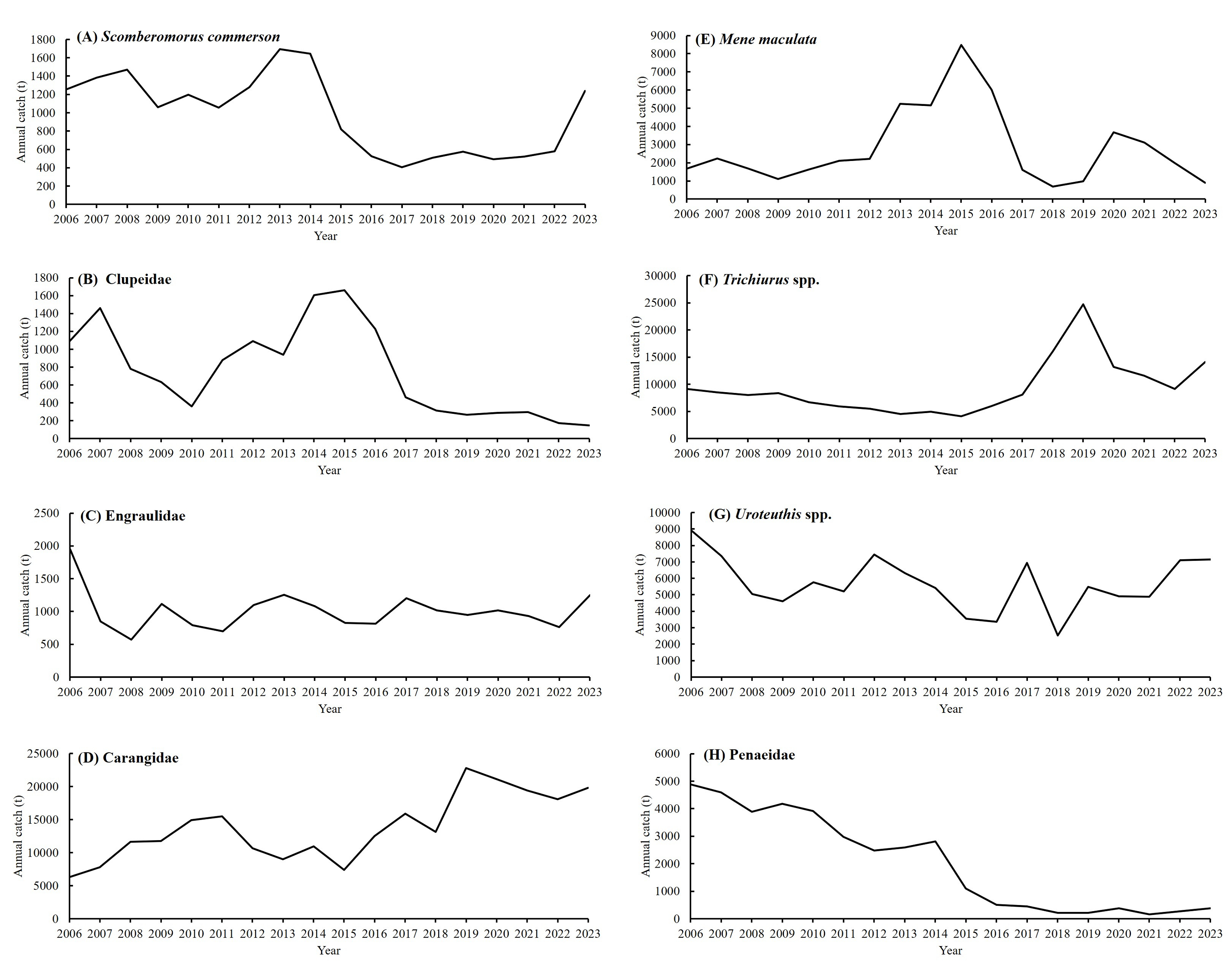 Annual catch trends of S. commerson (A), Clupeidae (B), Engraulidae (C), Carangidae (D), Mene maculata (E), Trichiurus spp. (F), Uroteuthis spp. (G), and Penaeidae (H) in Taiwanese waters from 2006 to 2023.