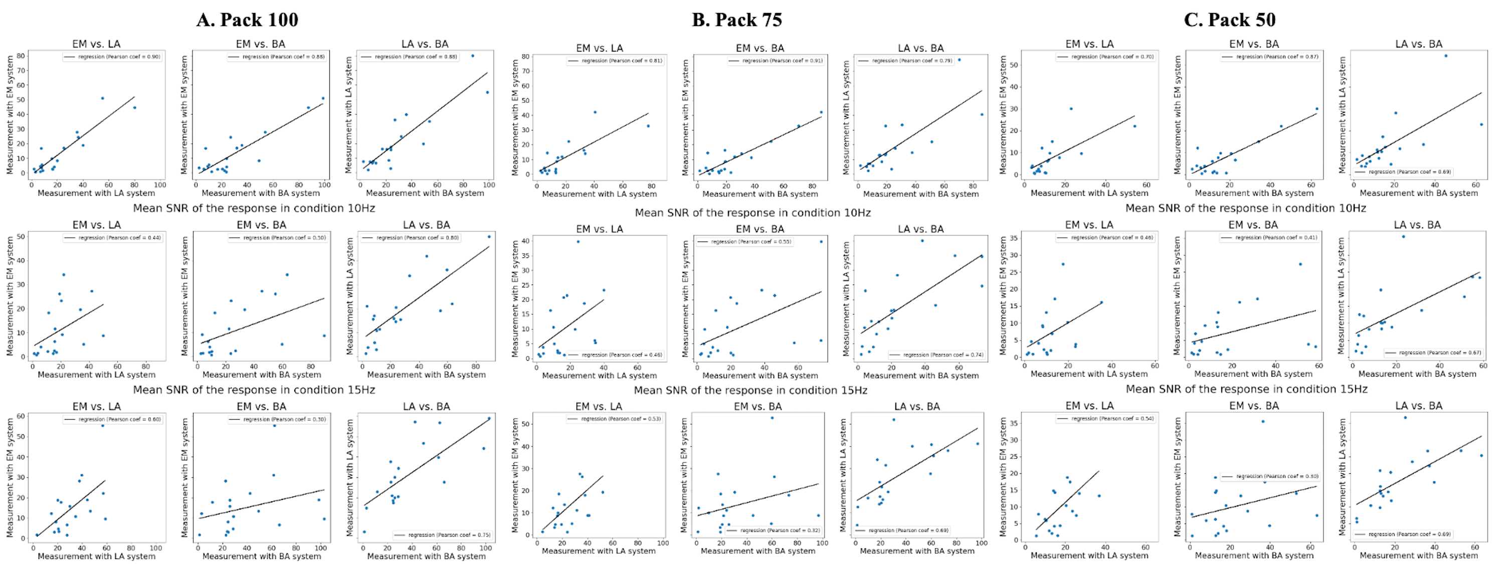 We also found that flickering stimuli evoked oscillatory brain responses exactly at the periodic stimulation frequency and its two first harmonics (SSVEP) across every EEG system. It should be noted that, with LA, these effects were large in size even on a short recording (15-s), highlighting the efficiency of this portable research-grade system in assessing oscillations, but a drop in effect size was however observed in Packs-75 and -50 compared to Pack-100 for LA, not for BA. Consequently, using only 15- or 22.5-s recording, comparable effect sizes were obtained with LA and EM systems, in line with similar spectral effects shown using EM and a medical-grade EEG system during emotional clips perception (Katsigiannis & Ramzan, 2018).