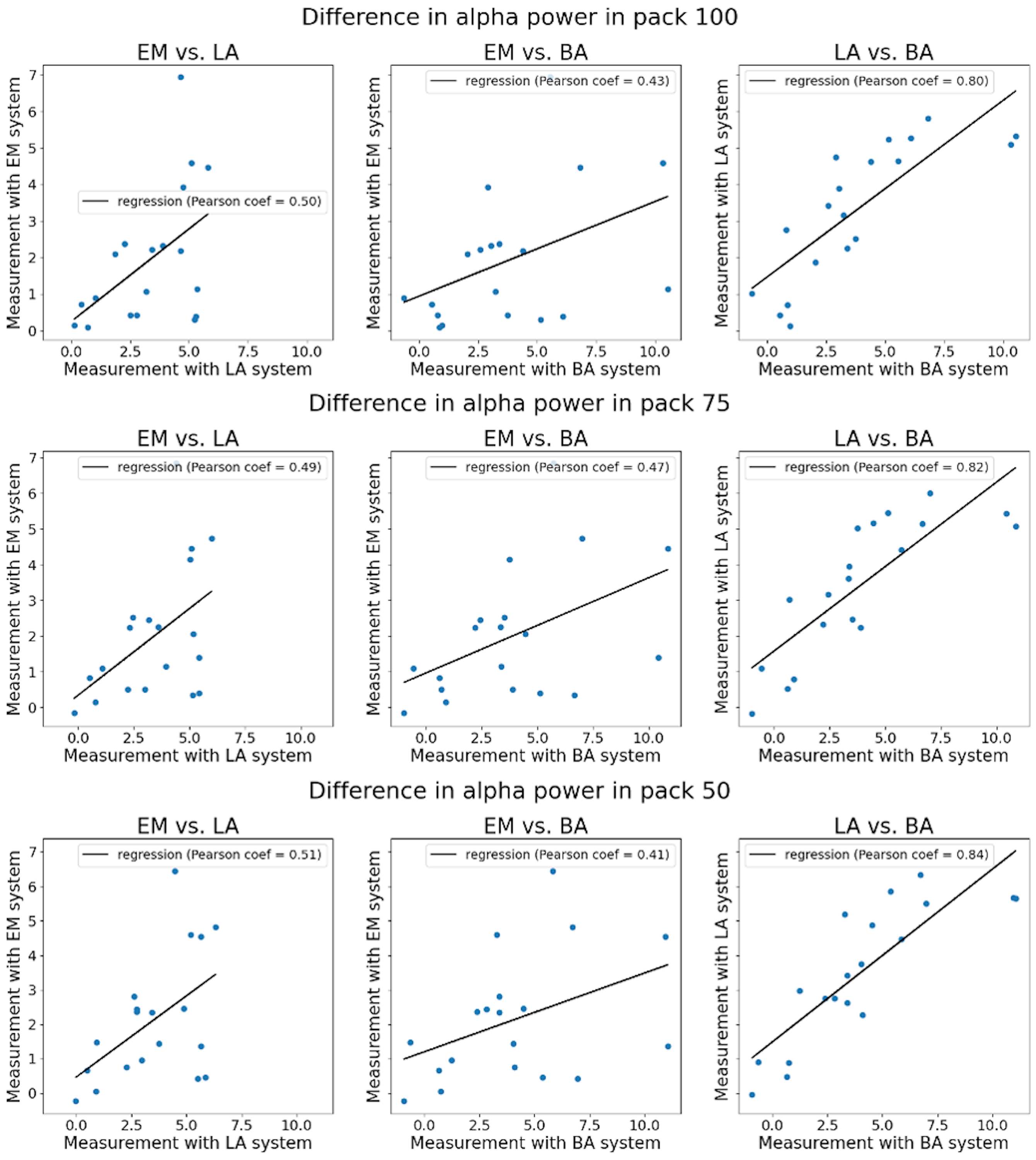 Consistent with our hypothesis, all three EEG systems captured the occipital Berger Effect already observed in adults (Johnstone, Blackman & Bruggemann, 2012; Cannard, Wahbeh & Delorme, 2021; An et al., 2022) and children (Barry et al., 2009; Bhavnani et al., 2022; Edgar et al., 2023). The effect was stable and large in size even in the 30-s Pack-50 with every system, though it was of larger size with LA and BA compared to the consumer-grade EM system. These differences in spectral responses could not be attributed to discrepancy between recording resolution, as the three systems were equated in sampling rate. Though the Berger Effect has previously been reported with very minimalist devices (Johnstone, Blackman & Bruggemann, 2012; Debener et al., 2015; Shivaraja et al., 2023), mixed results were obtained from a 14-electrode EM system (Grummett et al., 2015; Mahdid, Lee & Blain-Moraes, 2020; Kounios et al., 2024). In the current study, the 32-electrode mobile EM system proved effective in assessing oscillations and succeeded in demonstrating the Berger Effect.