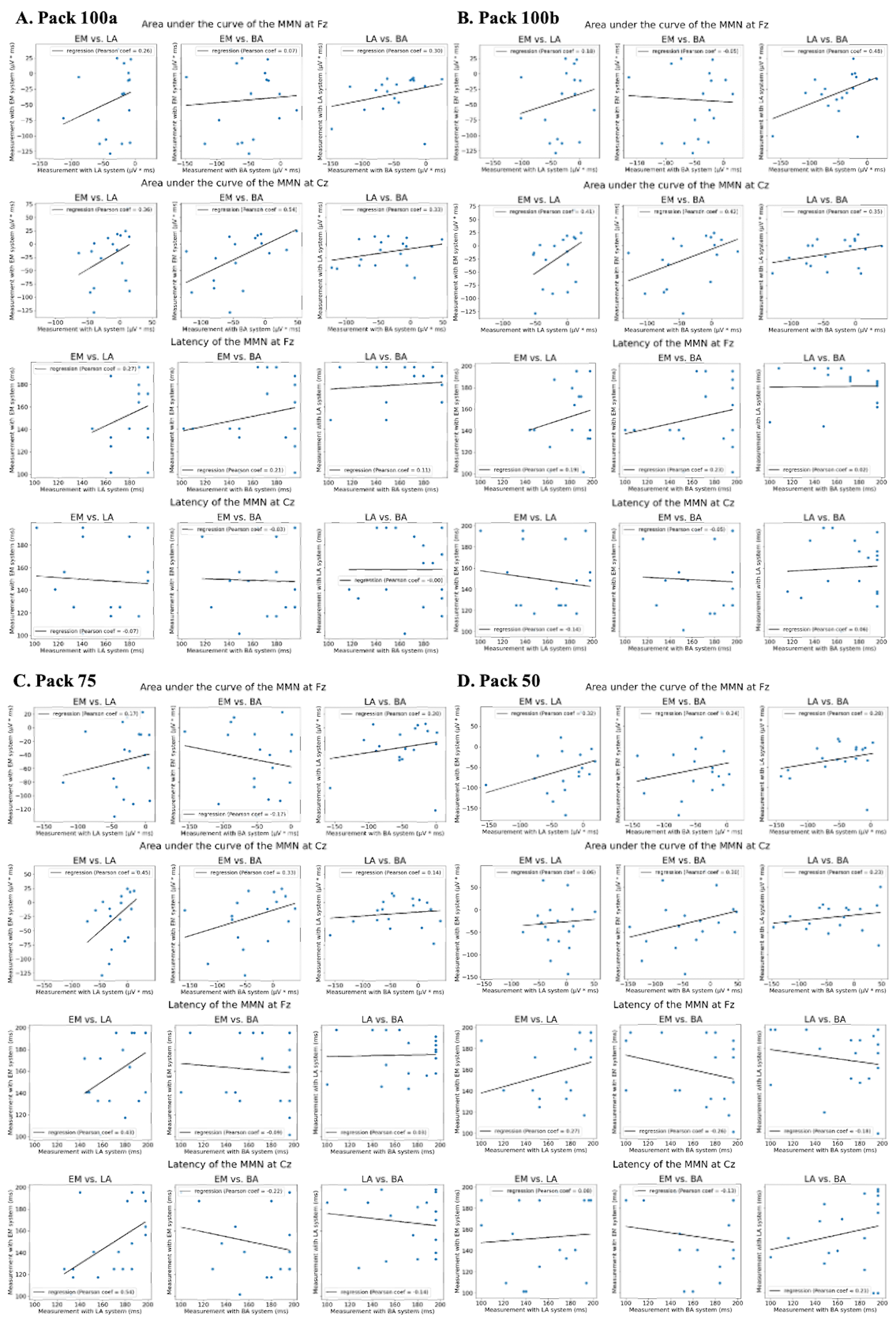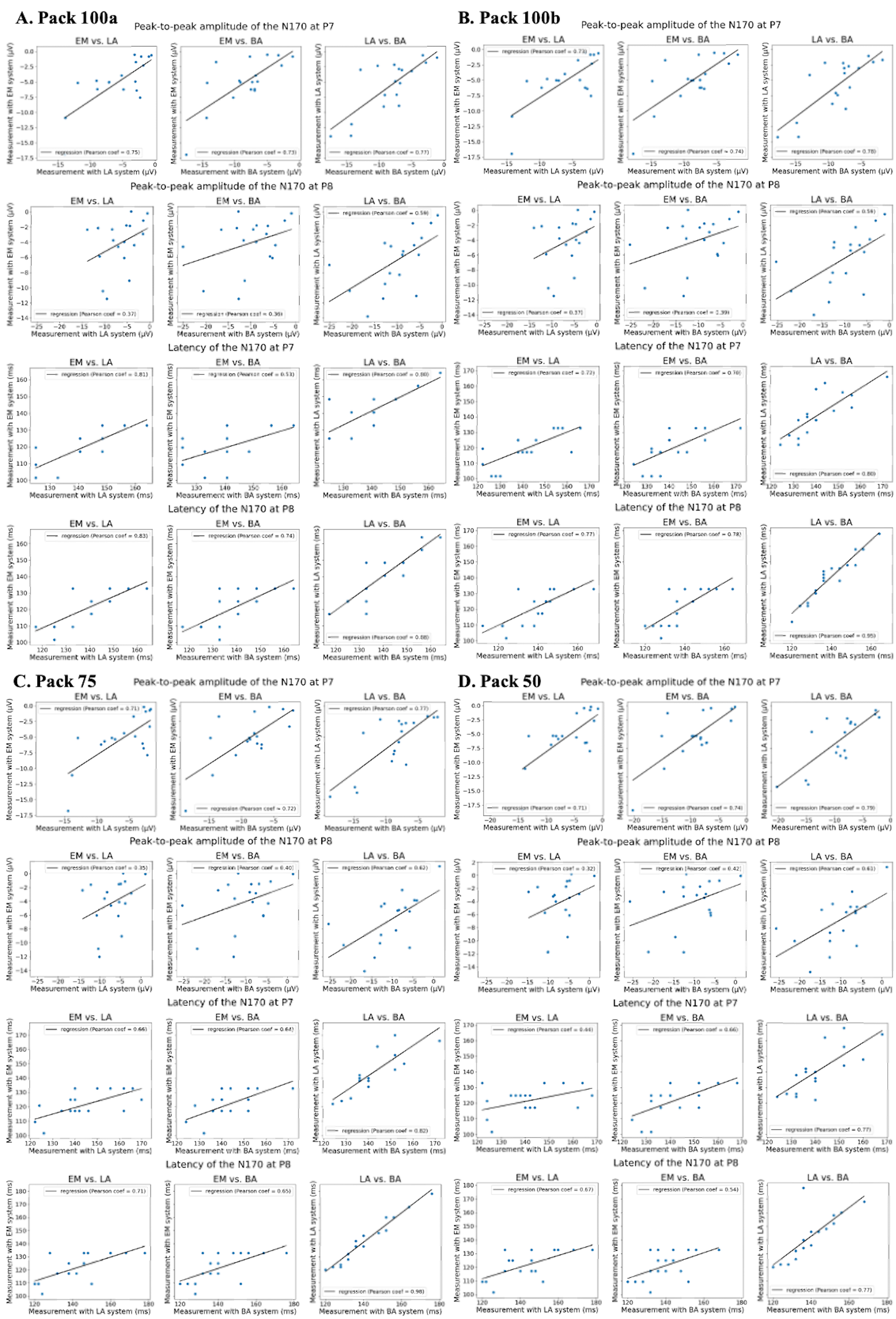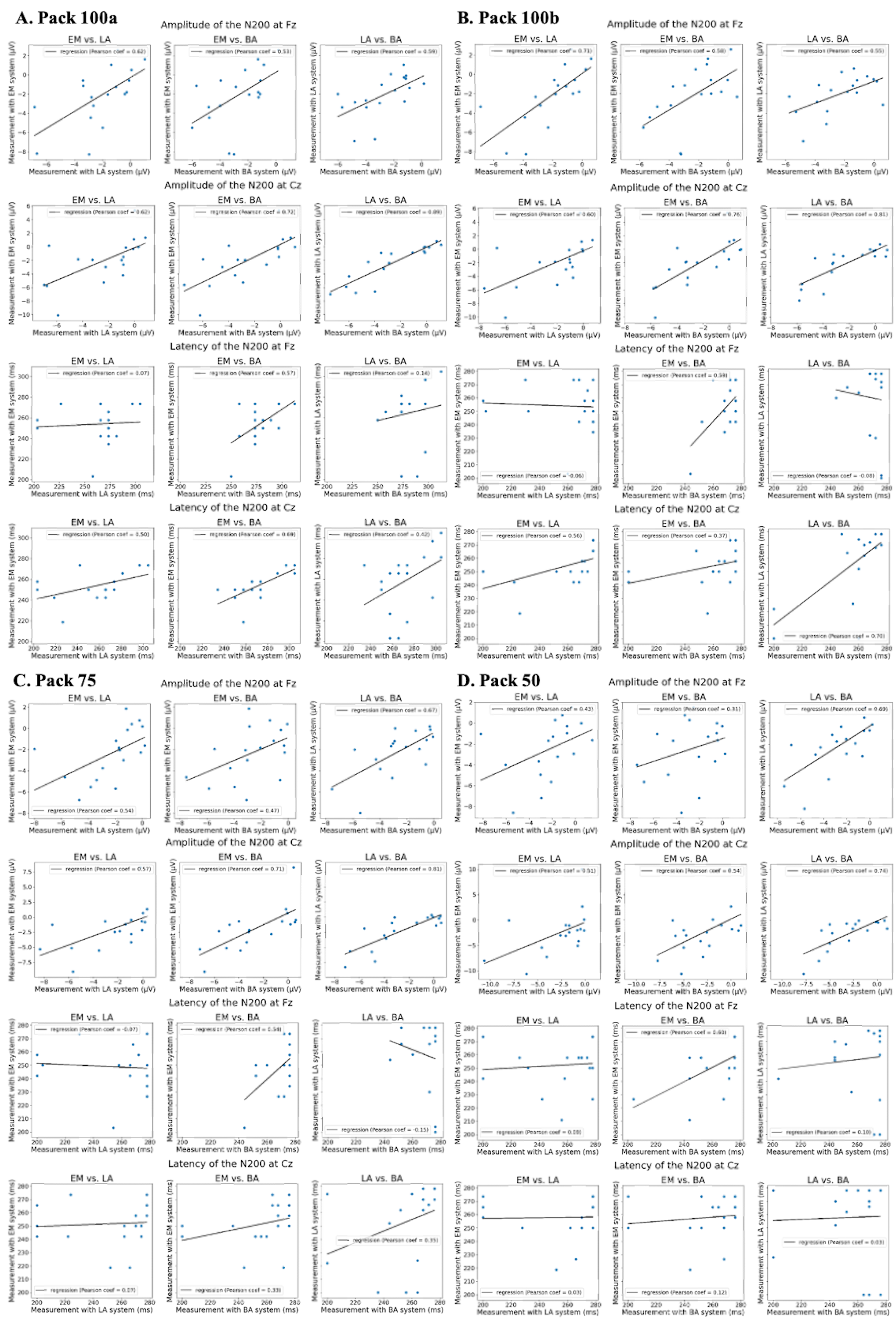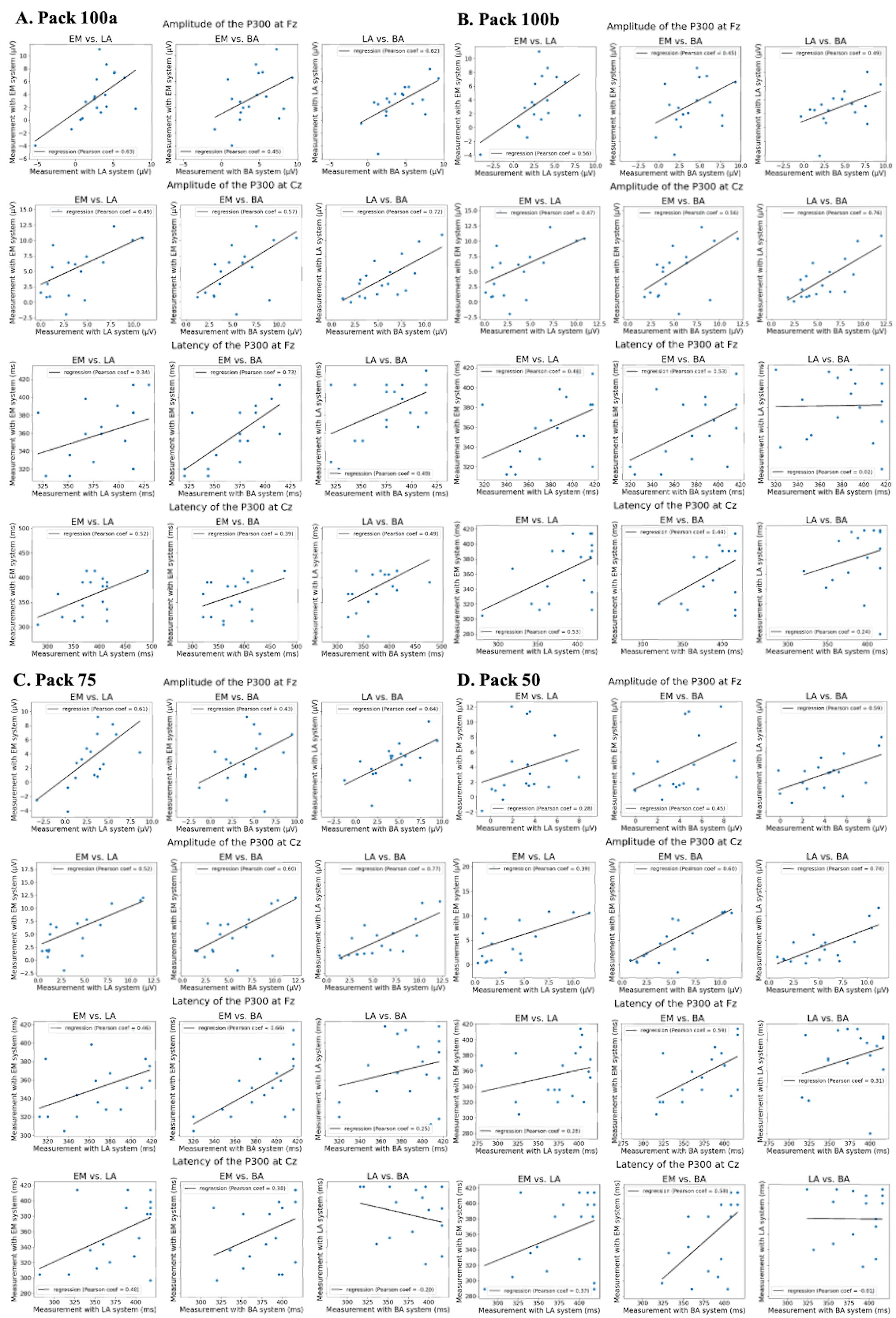 BA and LA data were downsampled to 128 Hz to match the EM’s native sampling rate, referred to as Pack-100a. For the three ERP tasks, an additional analysis retained LA and BA recordings at their native rates of 500 and 250 Hz, respectively (Pack-100b). Further analyses on raw data included the first 75% or 50% of trials for each task (Pack-75, Pack-50).