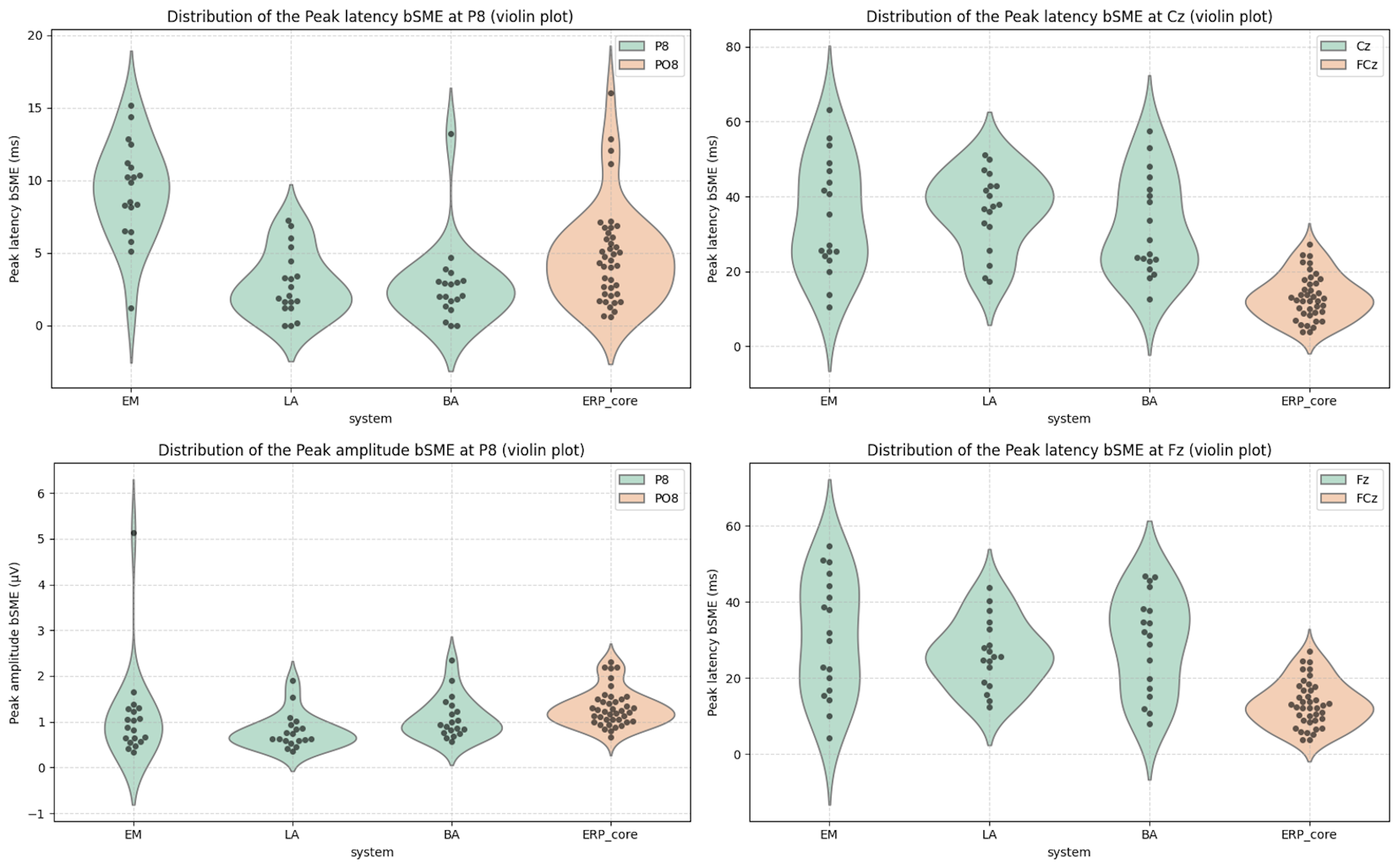 Data are shown in Table 12. Key findings were (1) systematically lower SME for the LA system measuring MMN, N170, N2 and P3 amplitude (LA < BA < EM), (2) no difference between systems when measuring latencies except the EM > LA = BA pattern at P8 and the EM > BA at P7 for the N170, (3) regarding the N170, each system had a lower SME than the ERP CORE dataset for both amplitude and latency, whereas EM exhibited a higher SME that the ERP CORE, (4) as to the MMN latency, higher SME was observed for each of the three systems as compared with the ERP CORE dataset (see Tables S1, S2 and Fig. S7).