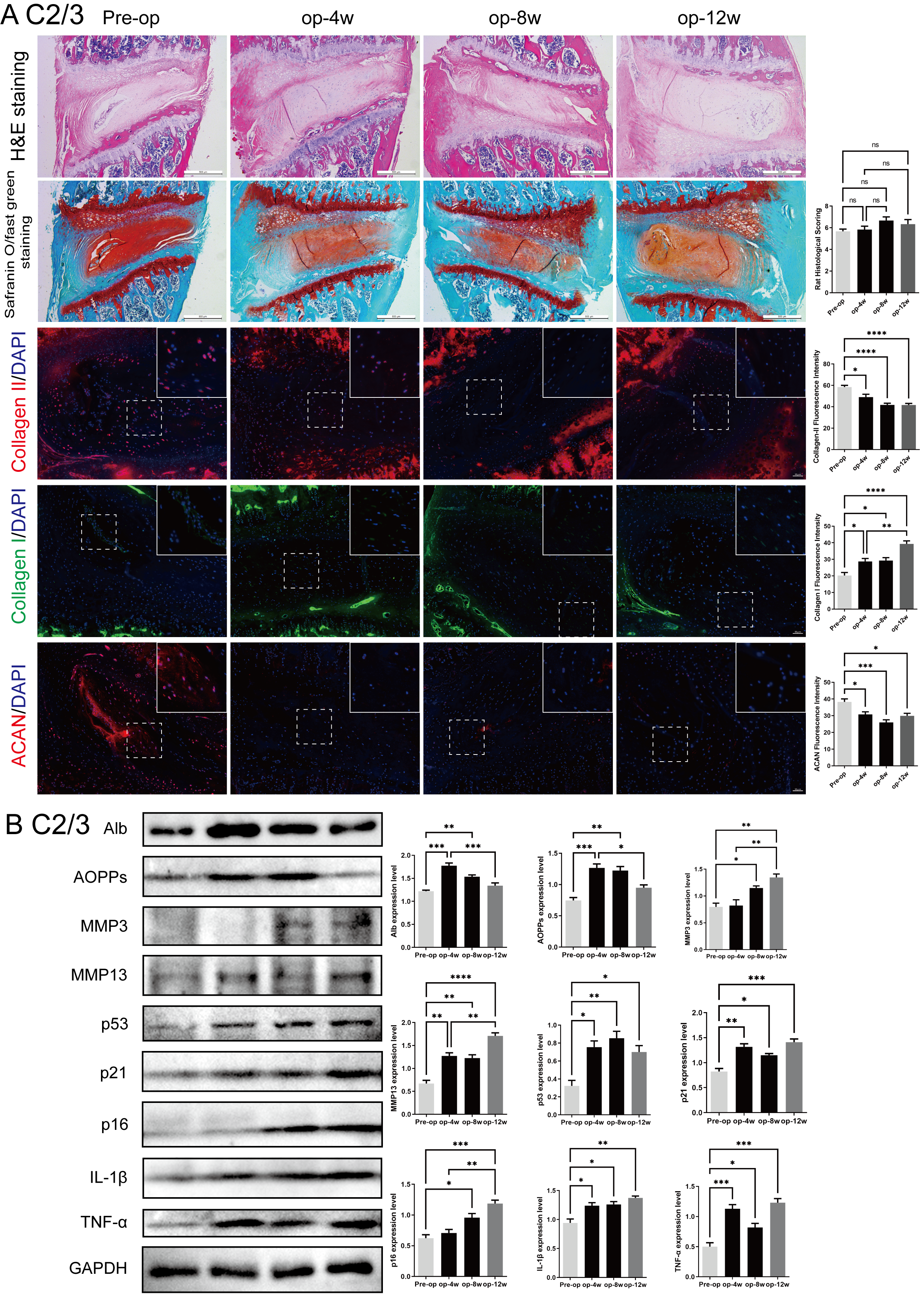 (A) H&E staining, safranin O-fast green staining, Col II/DAPI staining, Col I/DAPI staining, and ACAN/DAPI staining showed histological changes before surgery (Pre op), 4 weeks after surgery (op-4w), 8 weeks after surgery (op-8w), and 12 weeks after surgery (op-12w). The bar chart on the right displays the corresponding quantitative analysis results. (B) Protein expression analysis of C2/3 segments. The Western blot results showed the expression levels of AOPPs, MMP3, MMP13, p53, p21, p16, IL-1β, and TNF-α, with GAPDH as the internal reference. The bar chart displays the changes in expression levels at different time points. Scale bars: 500 μm (histology); 20 μm (immunofluorescence). ns: no statistical significance, * P < 0.05, **P < 0.01, ***P < 0.001, ****P < 0.0001.