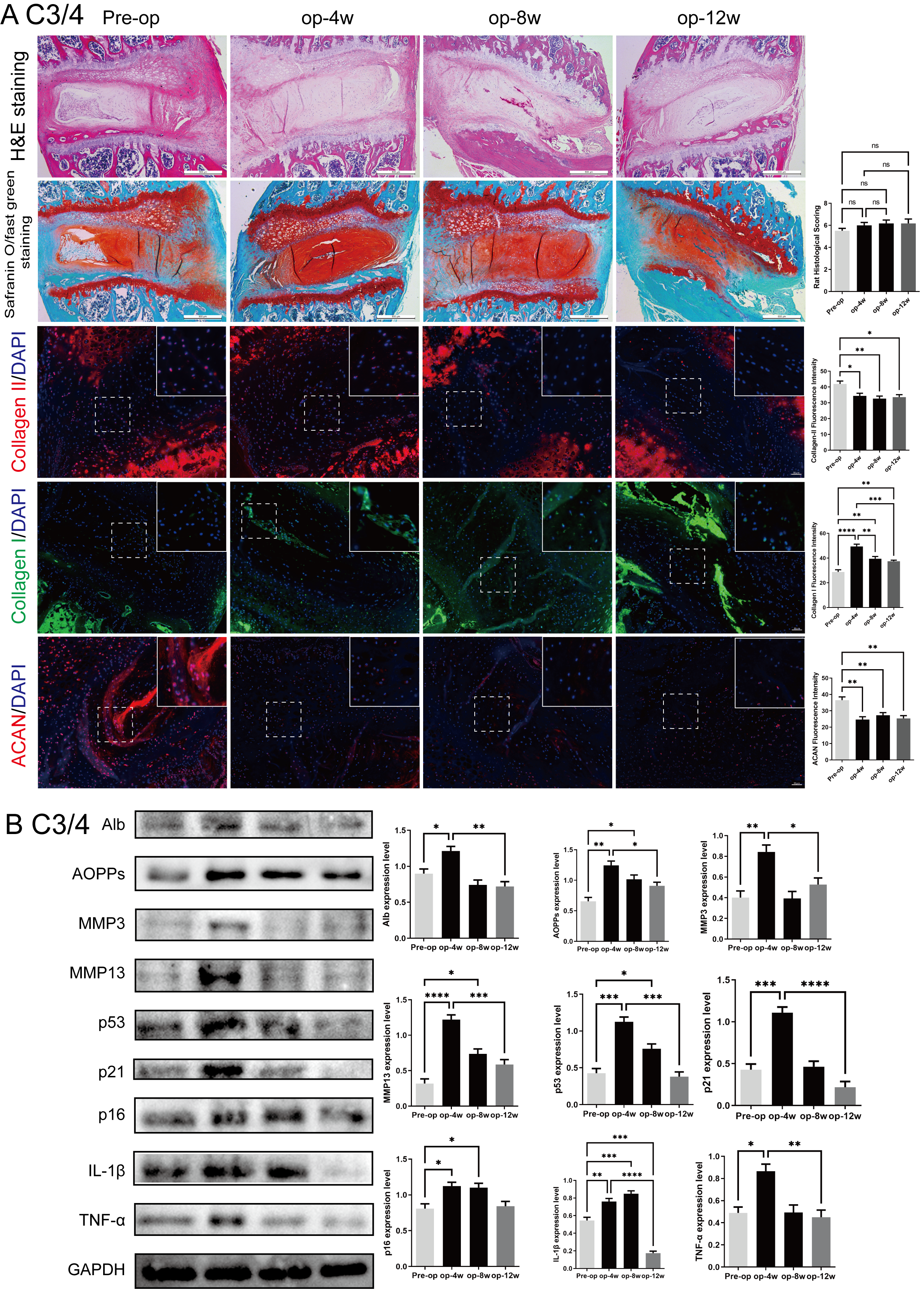 (A) H&E staining, safranin O-fast green staining, Col II/DAPI staining, Col I/DAPI staining, and ACAN/DAPI staining showed histological changes before surgery (Pre op), 4 weeks after surgery (op-4w), 8 weeks after surgery (op-8w), and 12 weeks after surgery (op-12w). The bar chart on the right displays the corresponding quantitative analysis results. (B) Protein expression analysis of C 3/4 segments. The Western blot results showed the expression levels of AOPPs, MMP3, MMP13, p53, p21, p16, IL-1β, and TNF-α, with GAPDH as the internal reference. The bar chart displays the changes in expression levels at different time points. Scale bars: 500 μm (histology); 20 μm (immunofluorescence). ns: no statistical significance, * P < 0.05, **P < 0.01, ***P < 0.001, ****P < 0.0001.