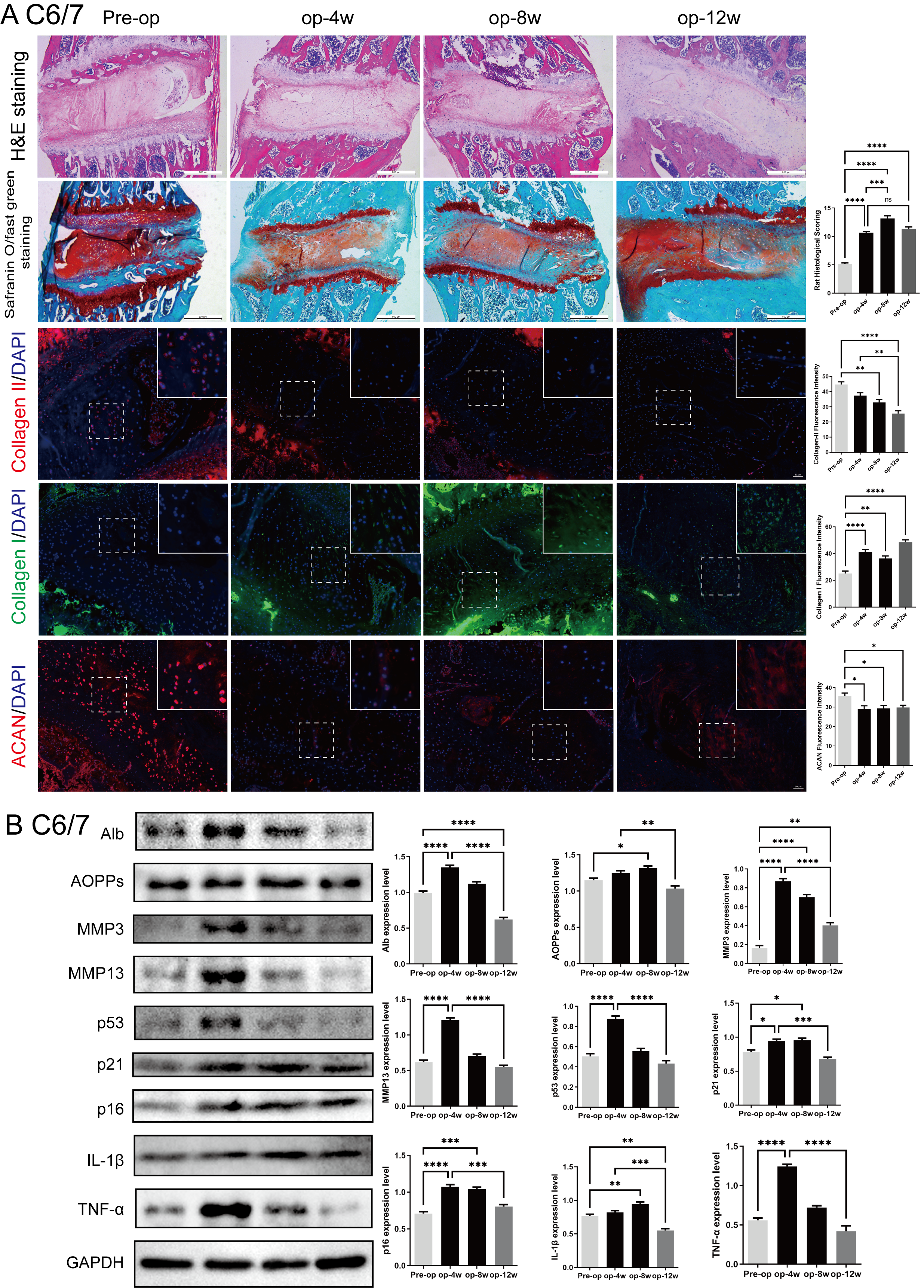 (A) H&E staining, safranin O-fast green staining, Col II/DAPI staining, Col I/DAPI staining, and ACAN/DAPI staining showed histological changes before surgery (Pre op), 4 weeks after surgery (op-4w), 8 weeks after surgery (op-8w), and 12 weeks after surgery (op-12w). The bar chart on the right displays the corresponding quantitative analysis results. (B) Protein expression analysis of C 6/7 segments. The Western blot results showed the expression levels of AOPPs, MMP3, MMP13, p53, p21, p16, IL-1β, and TNF-α, with GAPDH as the internal reference. The bar chart displays the changes in expression levels at different time points. Scale bars: 500 μm (histology); 20 μm (immunofluorescence). ns: no statistical significance, * P < 0.05, **P < 0.01, ***P < 0.001, ****P < 0.0001.