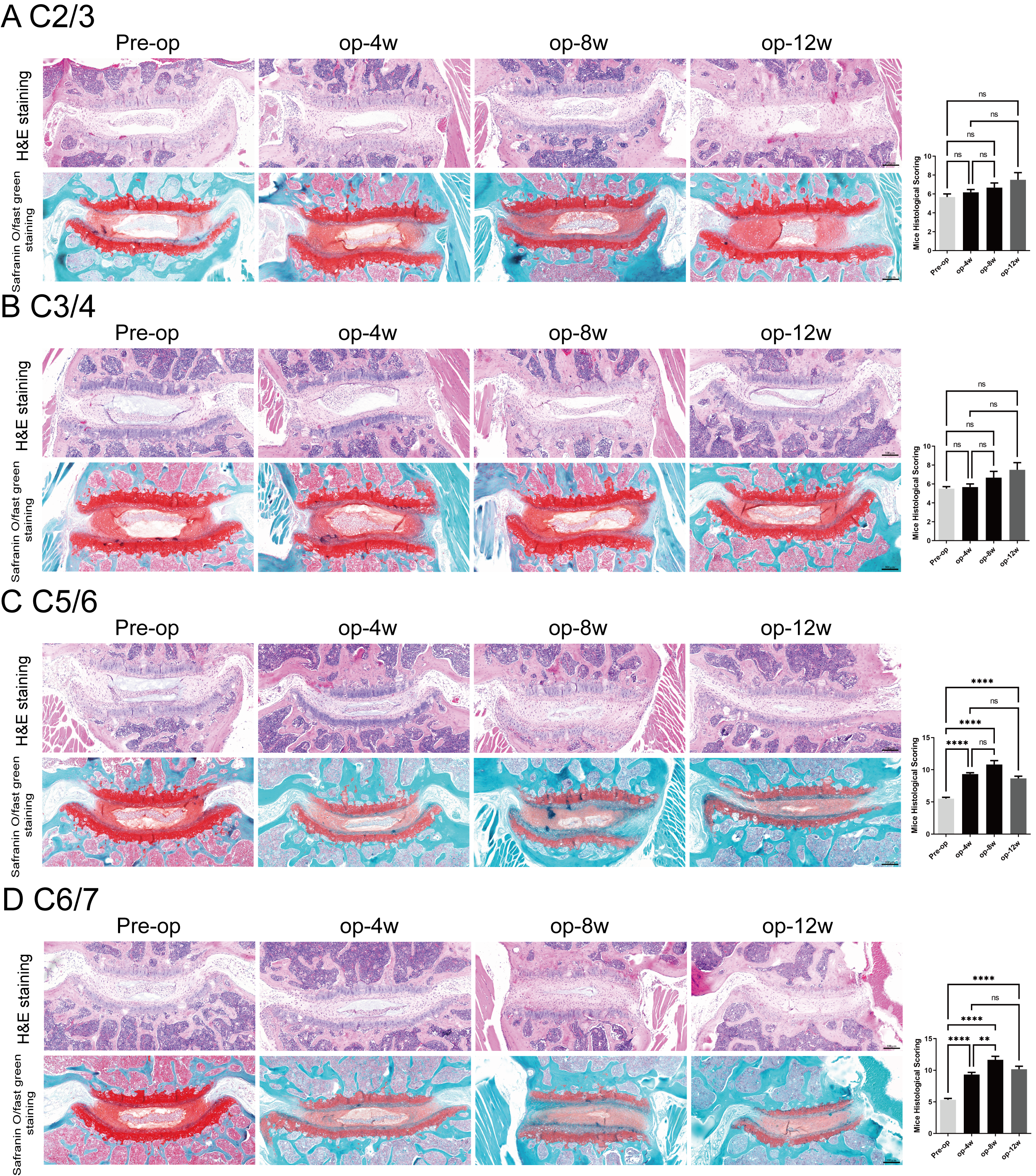 (A–D) H&E staining and Safranin O-fast green staining of cervical spine segments C2/3 (A), C3/4 (B), C5/6 (C), and C6/7 (D) showed histological changes before surgery (Pre op) and 4, 8, and 12 weeks after surgery (op-4w, op-8w, op-12w). Bar charts on the right display corresponding quantitative analysis results. Scale bars: 1 00 μm (histology). ns: no statistical significance, * P < 0.05, **P < 0.01, ***P < 0.001, ****P < 0.0001.