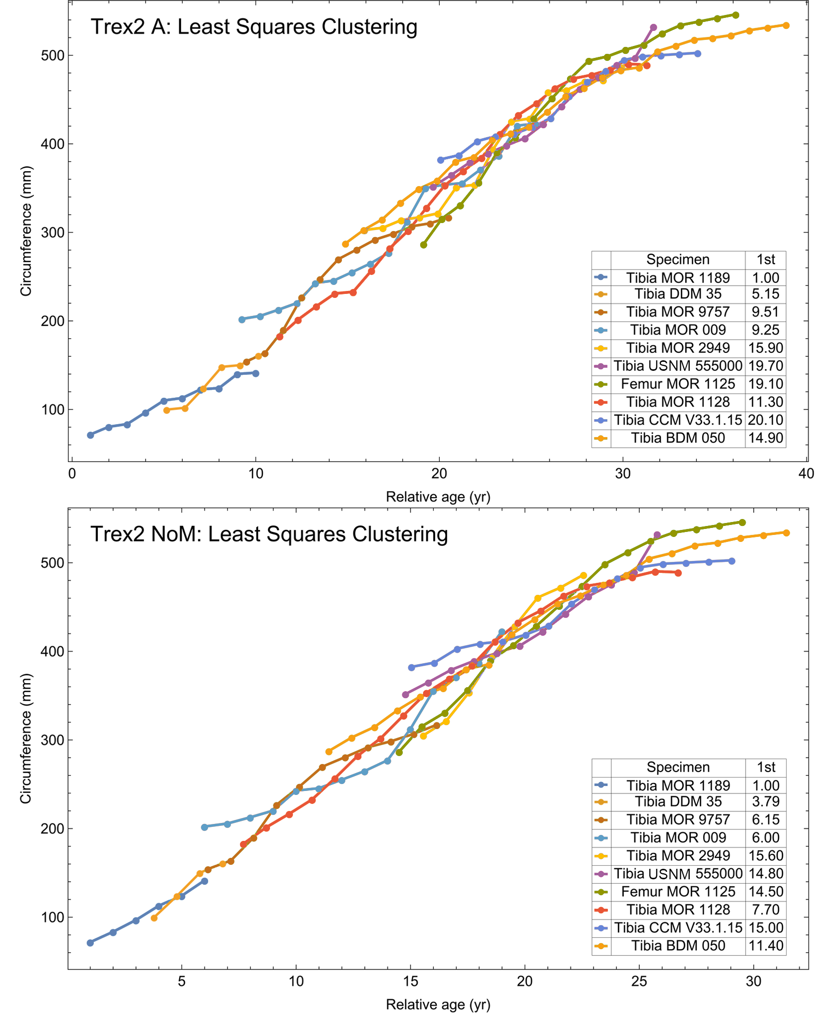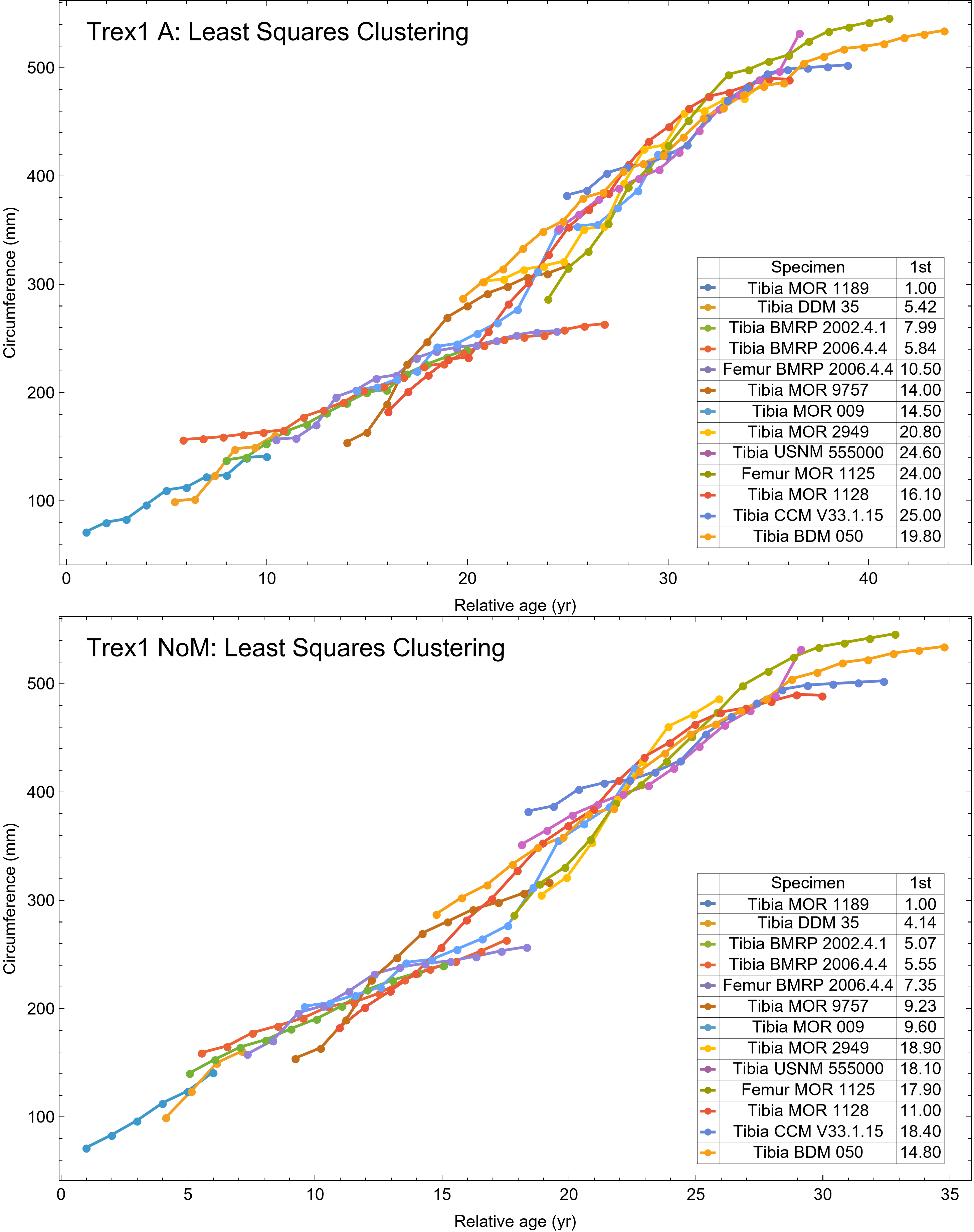 Tyrannosaurus dataset Trex1 growth series clustered by least squares, for A and NoM variants.