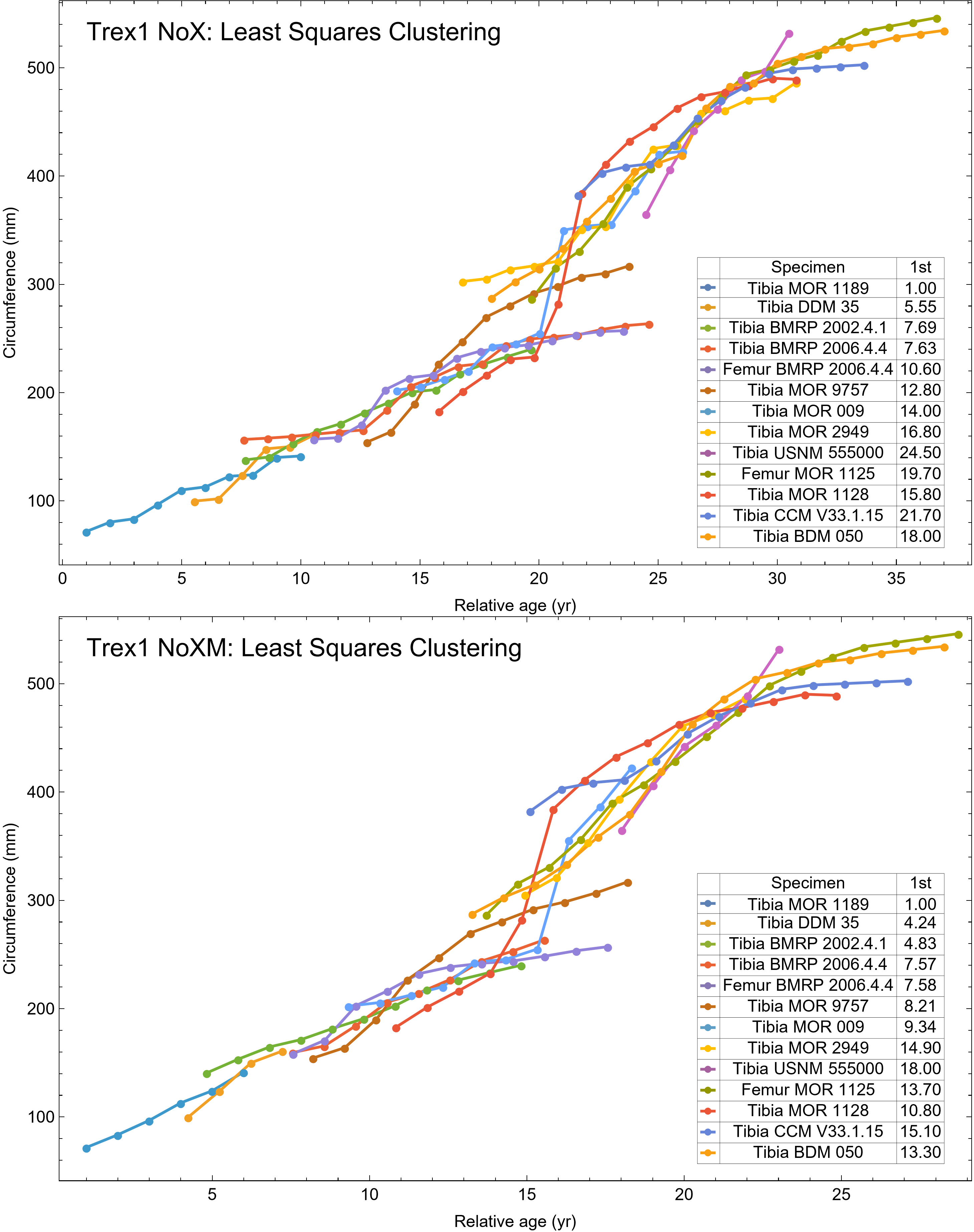 Tyrannosaurus dataset Trex1 growth series clustered by least squares, for NoX and NoXM variants.
