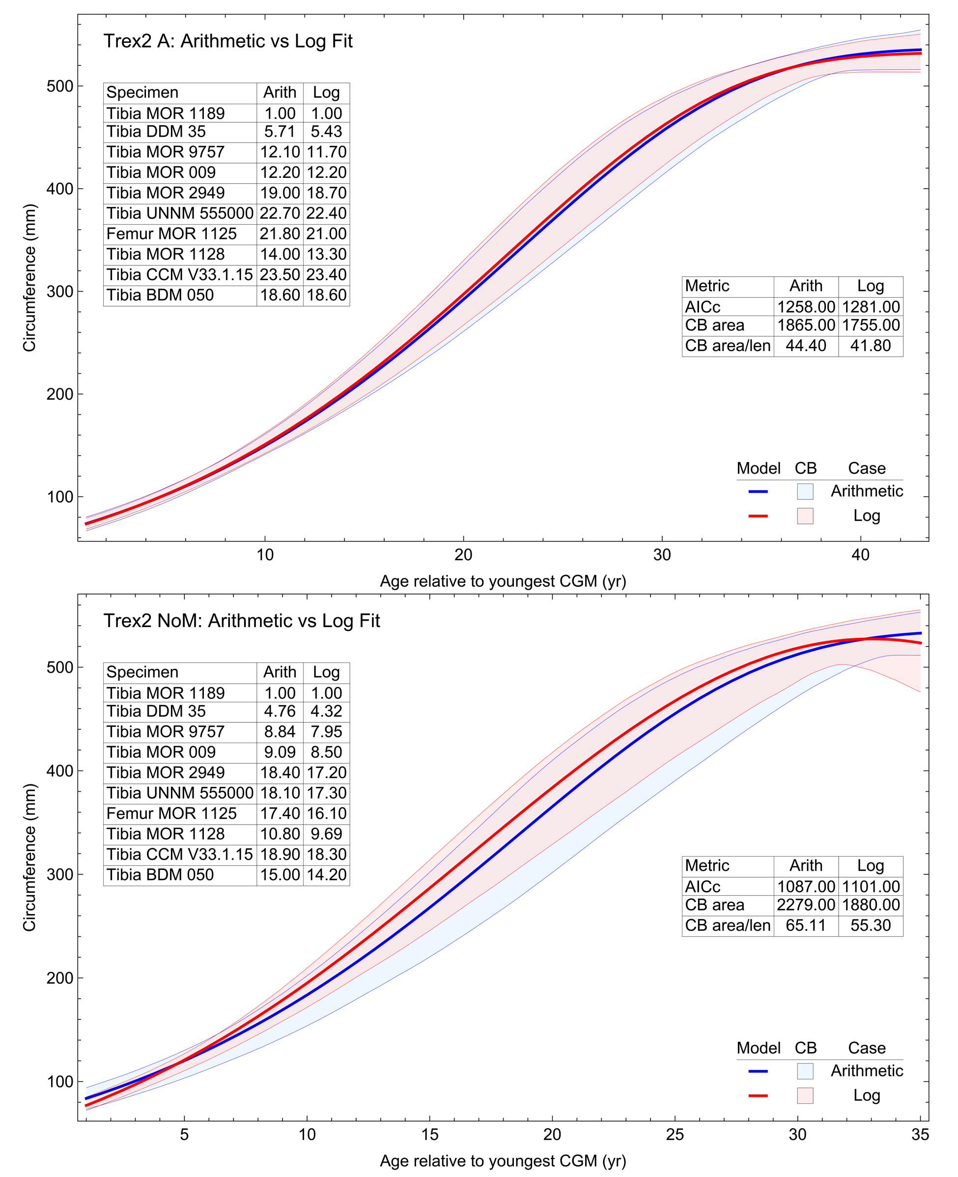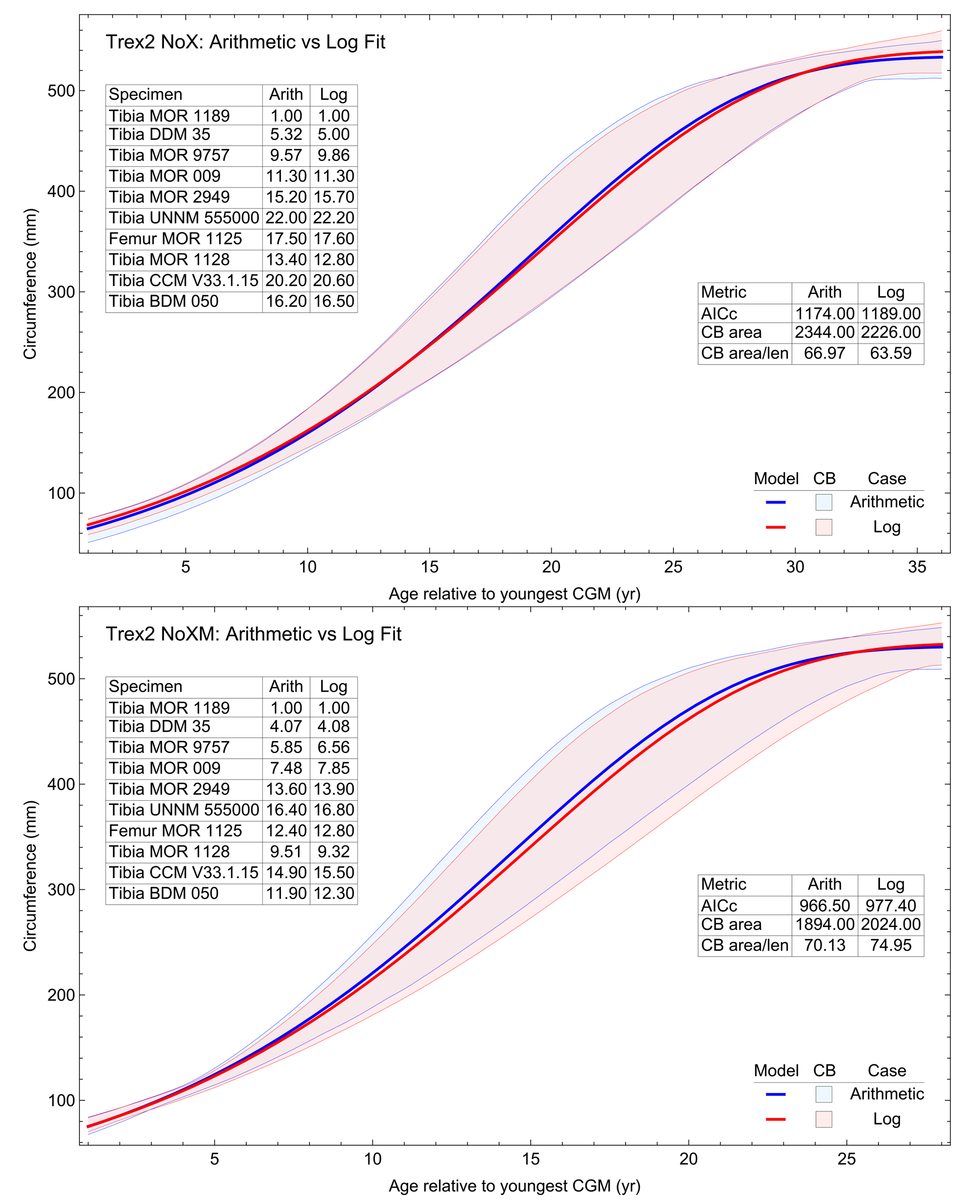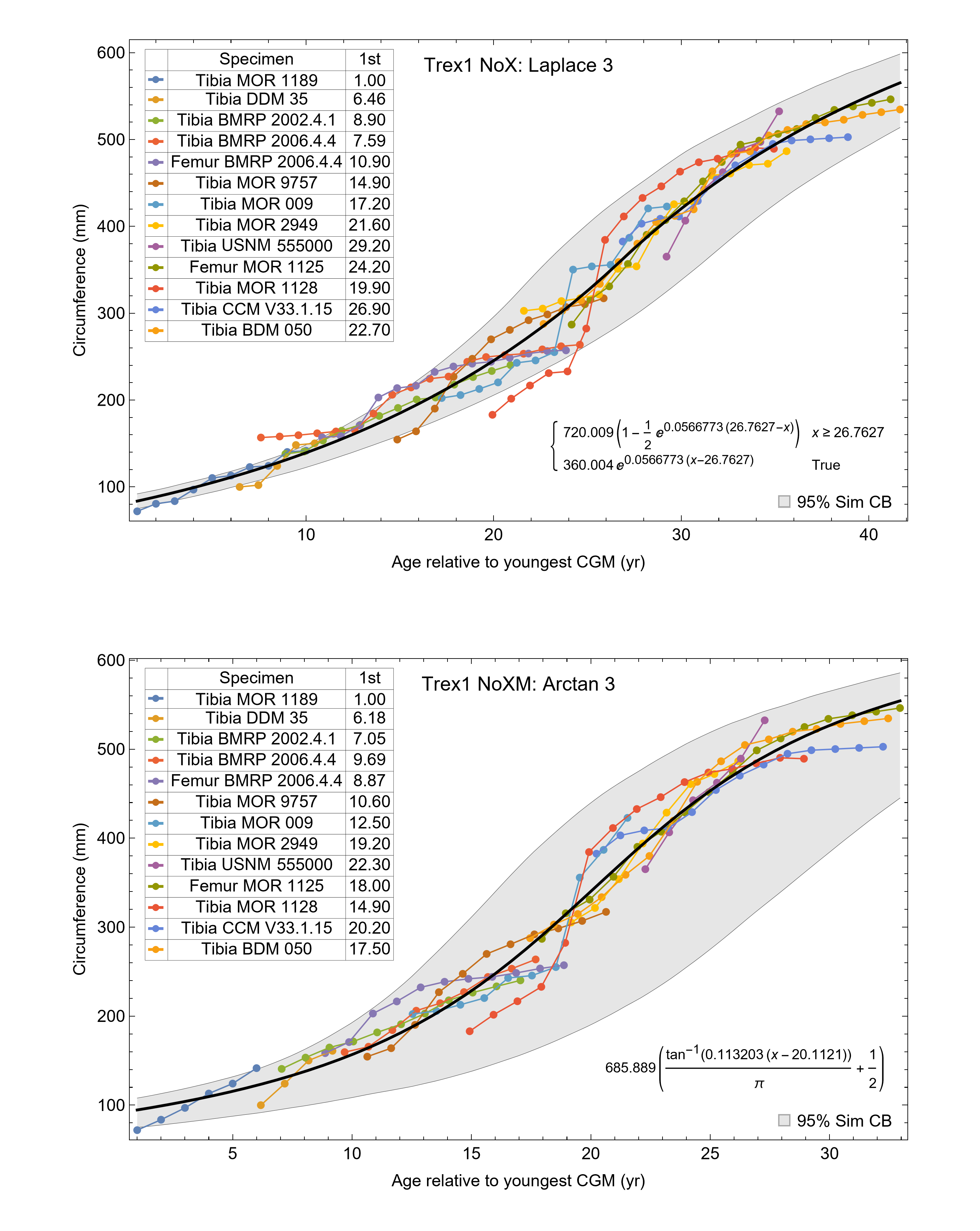 The 95% simultaneous confidence bands (CB) and best fit equations are shown, in this case the laplace 3 function for variant NoX and the arctan 3 function for variant NoXM. All ages are in years relative to the starting age of the smallest cortical growth mark (CGM) circumference in Tibia MOR 1189.