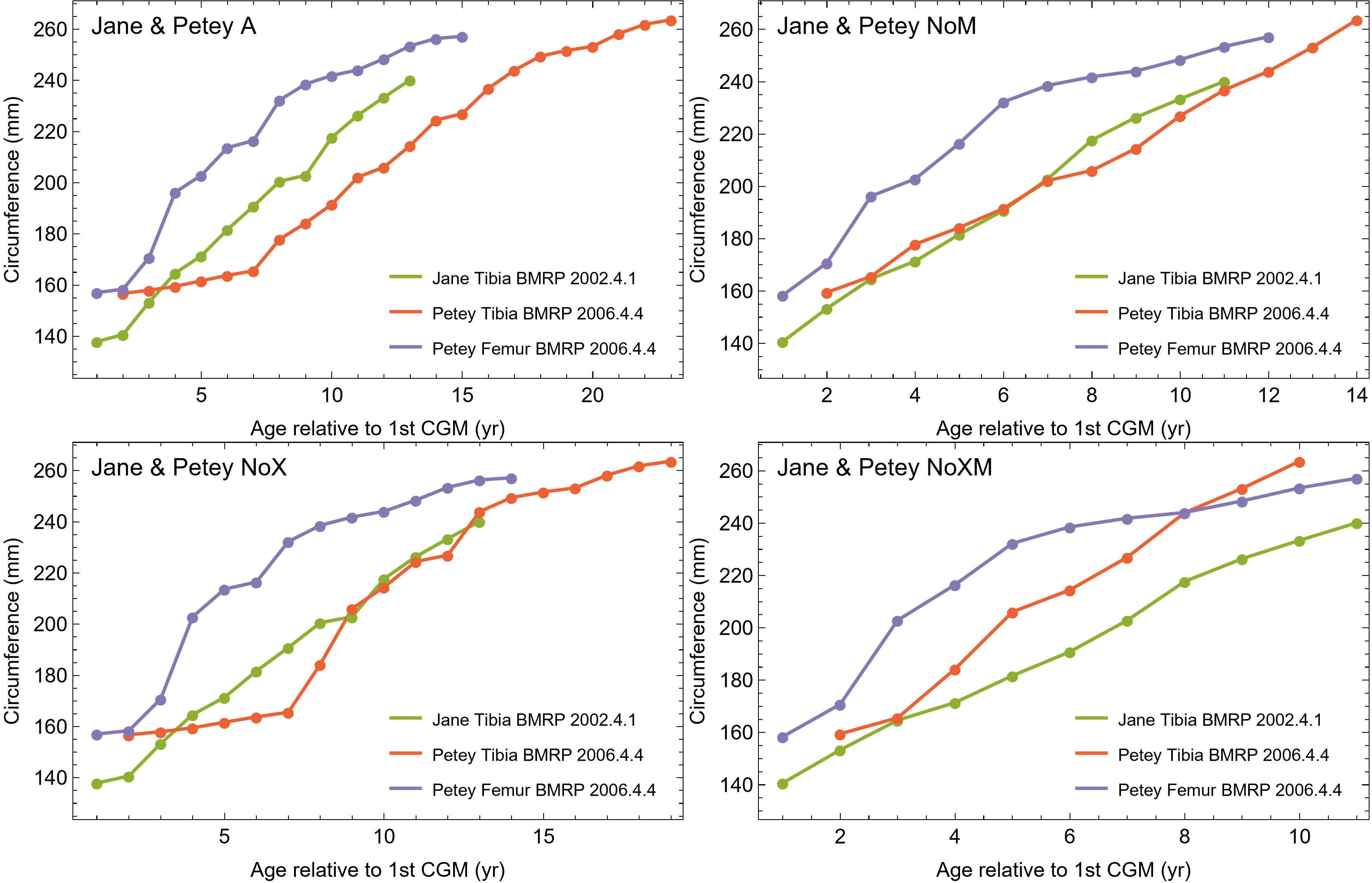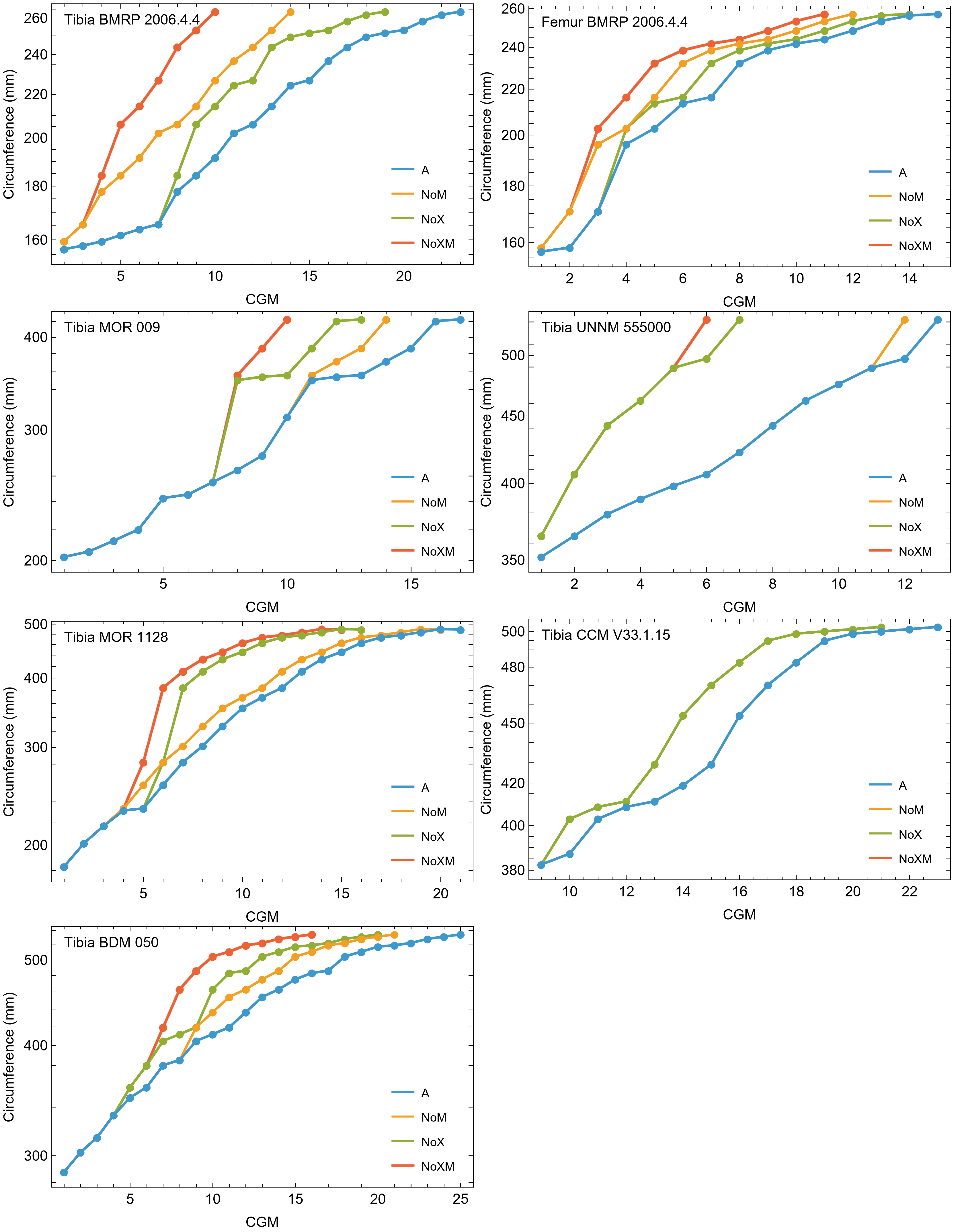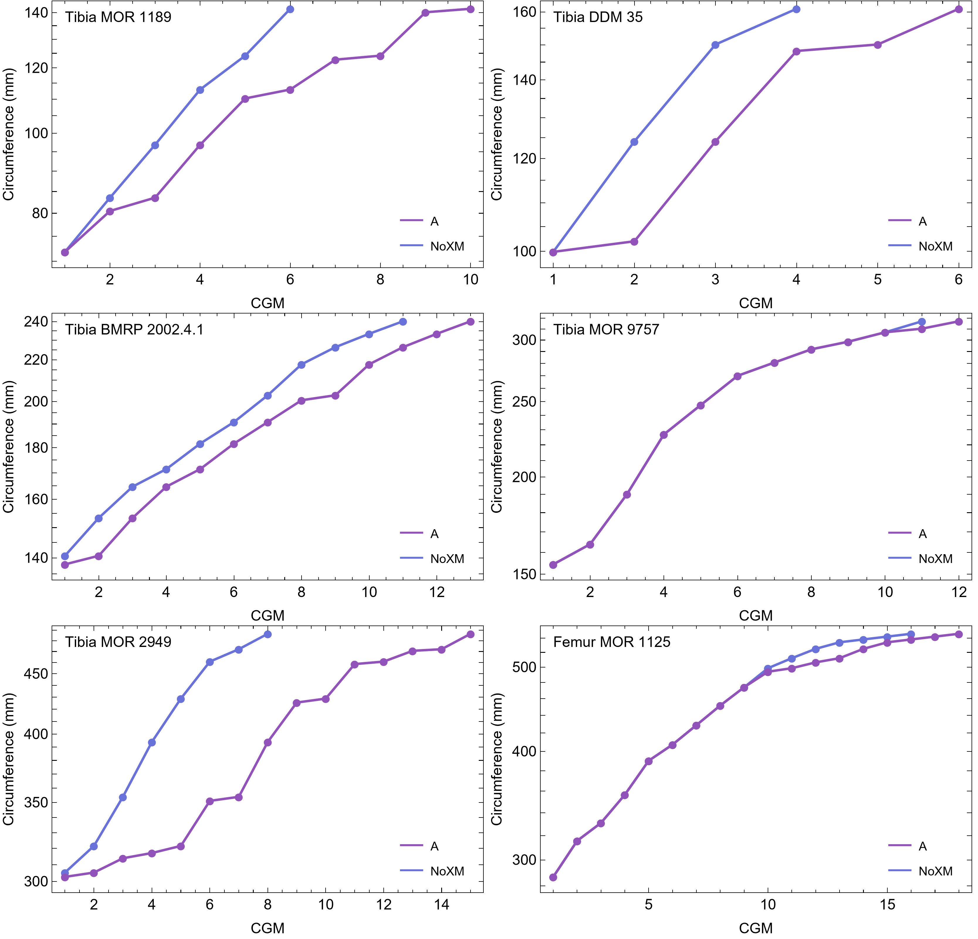 Note that the NoX variant is therefore identical to NoXM, and NoM is identical to A, so only NoXM and A variants are plotted. Cortical growth mark (CGM) count on the x-axis, CGM circumference on the y-axis.