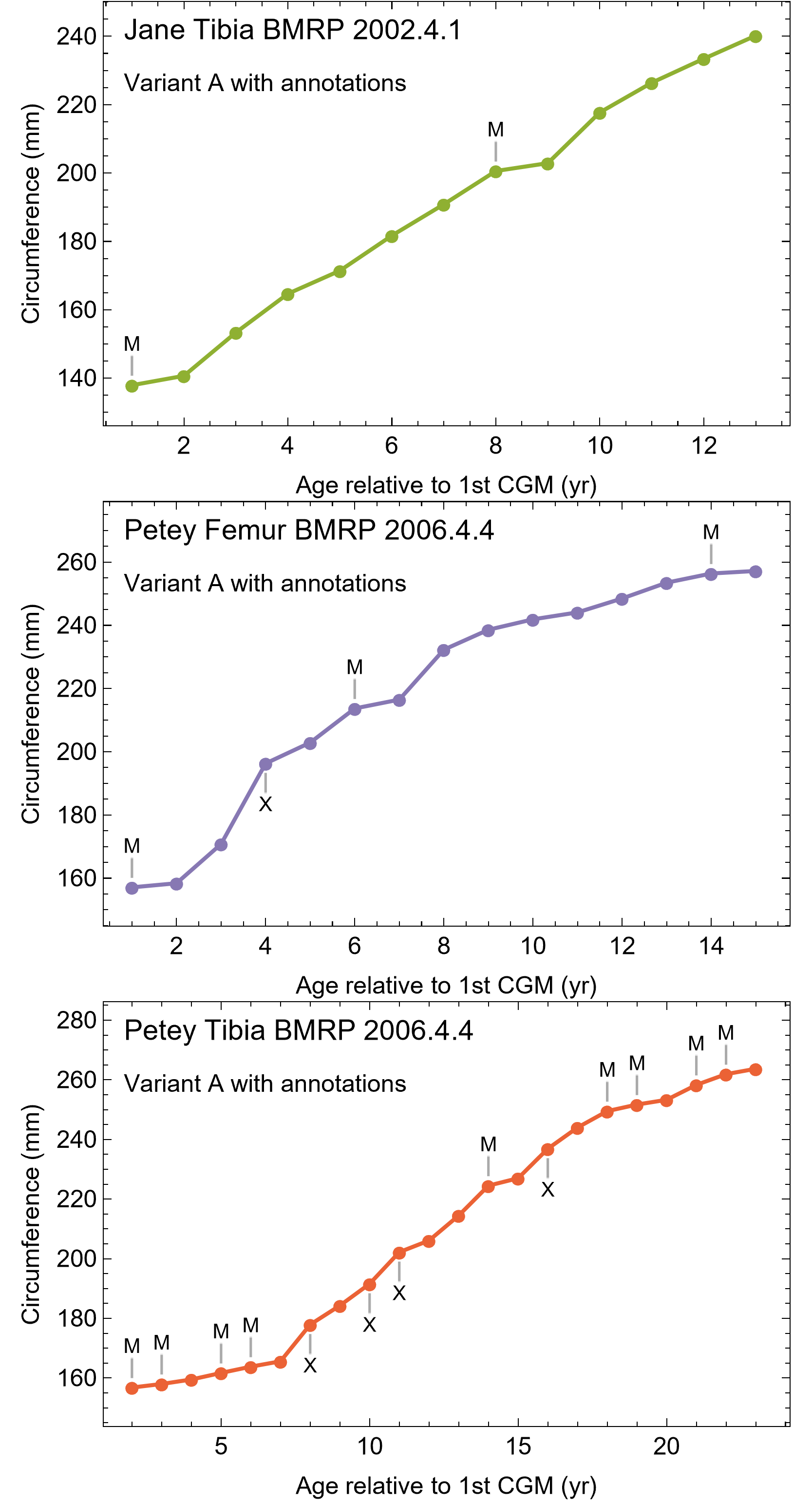 All ages are in years relative to the starting age of the smallest cortical growth mark (CGM) circumference in Tibia MOR 1189.