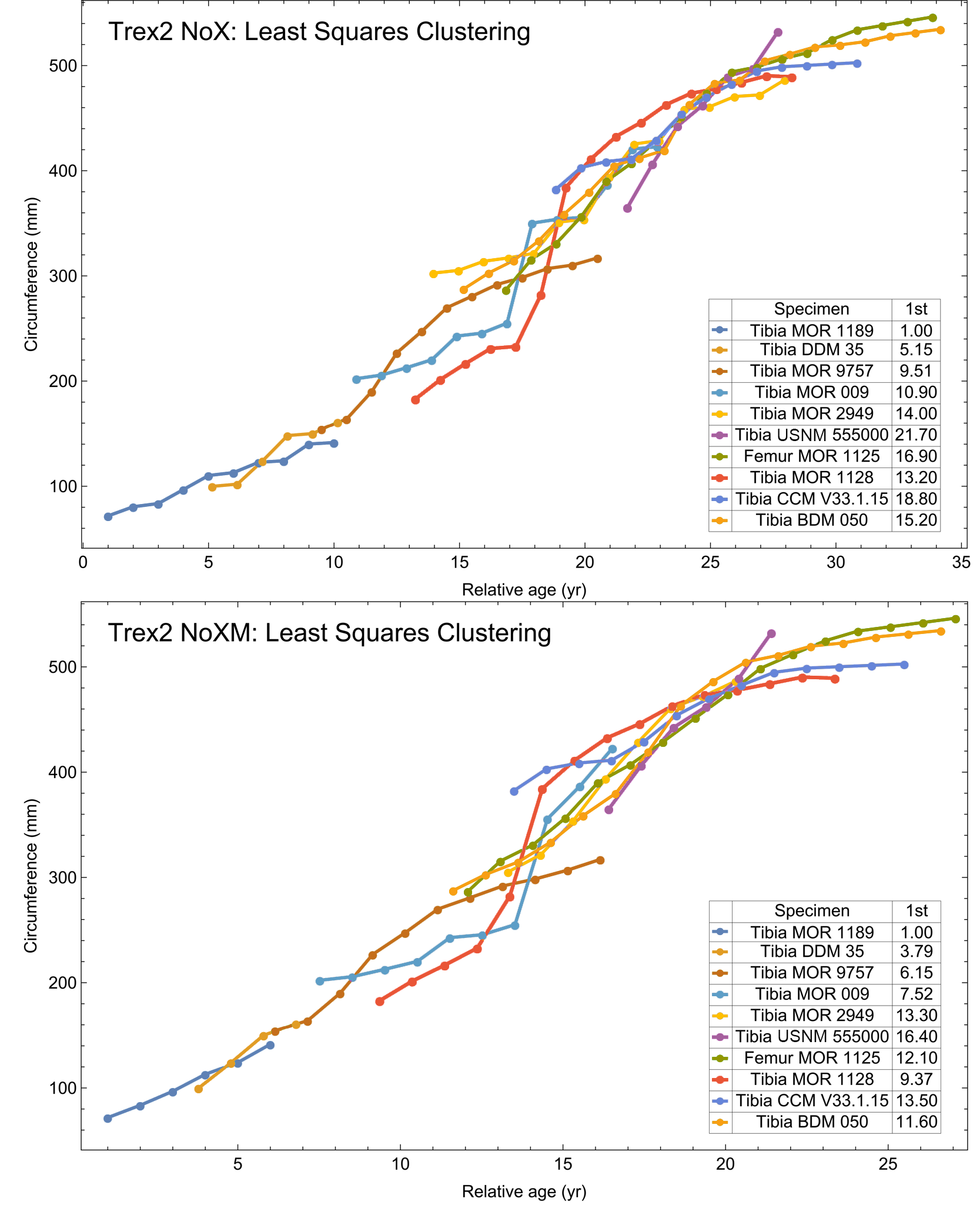 Tyrannosaurus dataset Trex2 growth series clustered by least squares, for NoX and NoXM variants.