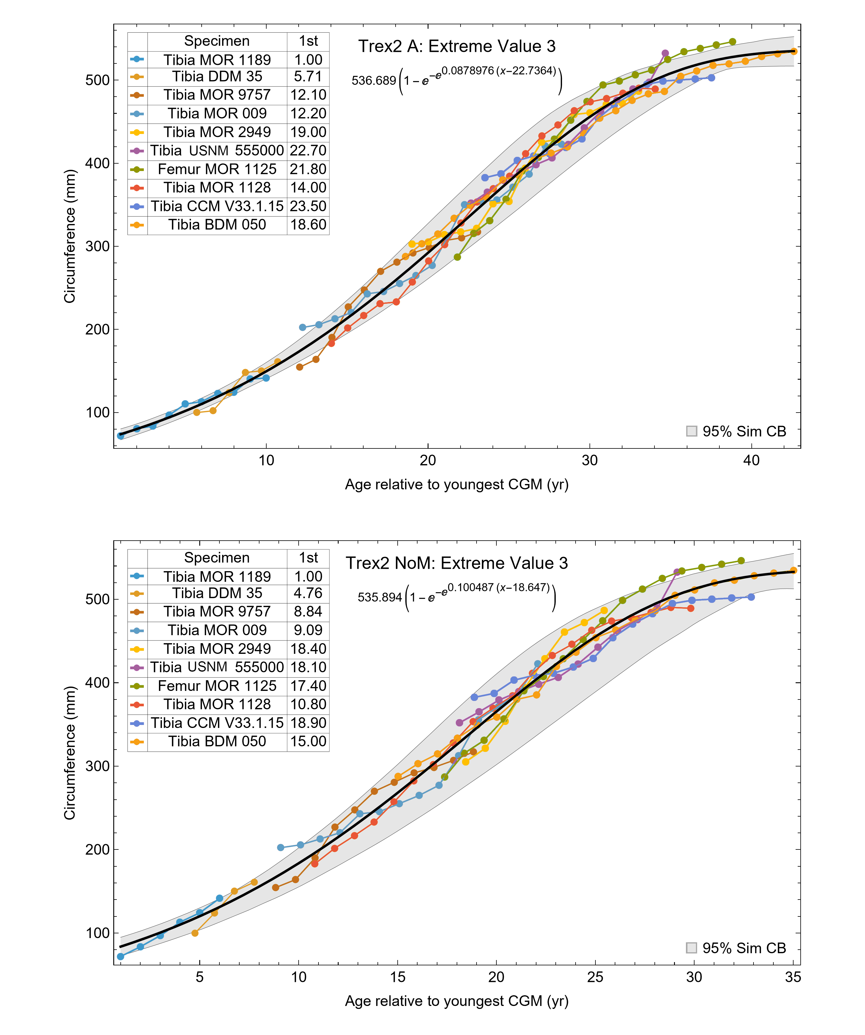 For each specimen, the starting CGM age is estimated using least squares minimization, and the numerical values are found in the inset table in the column labeled “1st”. All ages are in years relative to the starting age of the smallest circumference specimen, Tibia MOR 1189.After starting ages are applied, the next step is nonlinear ordinary least squares (OLS) curve fitting. Sigmoidal growth curves are used to fit the age, circumference data points ( from Eq. (2)). The variables are parameters, and t is the age. In this example we show three parameters , but the curves used here have number of parameters with .