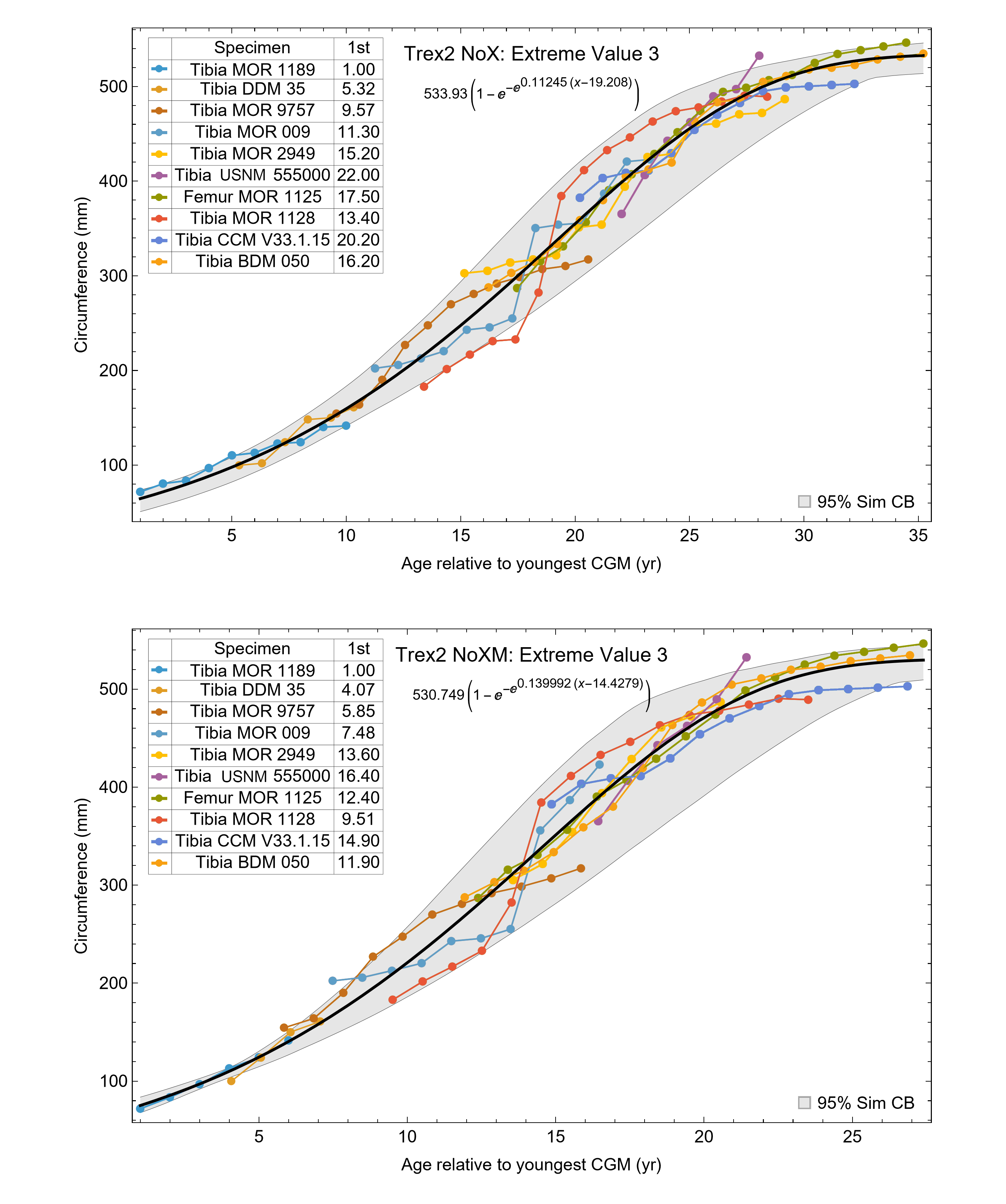 The 95% simultaneous confidence bands (CB) and best fit equations are shown, in this case the extreme value 3 function for both variants. All ages are in years relative to the starting age of the smallest cortical growth mark (CGM) circumference in Tibia MOR 1189.