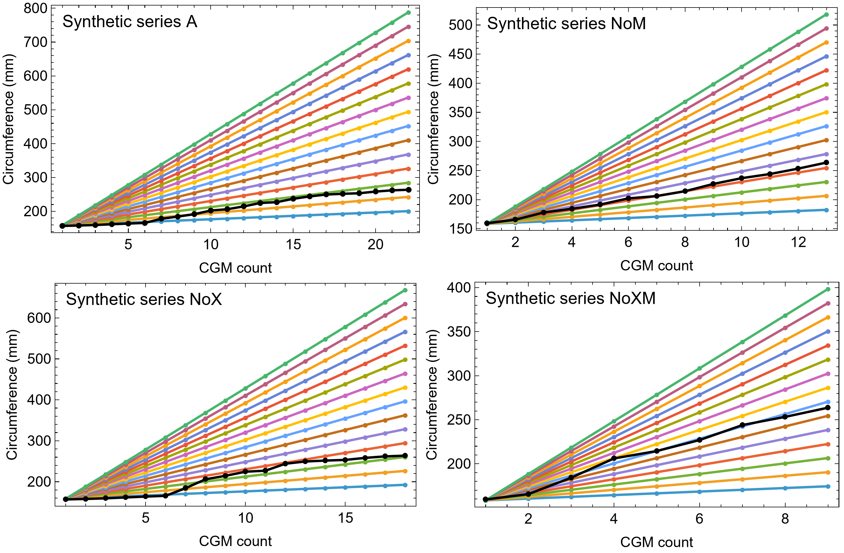 . Each panel shows a different variant (A, NoM, NoX, NoXM). The black growth series is Tibia BMRP 2006.4.4. The colored lines show linear growth series of the same length, but with constant linear growth rate ranging from 2 mm/year (bottom most line) to 30 mm/year (topmost line). Cortial growth mark (CGM) count on the x-axes, CGM circumference on the y-axes.