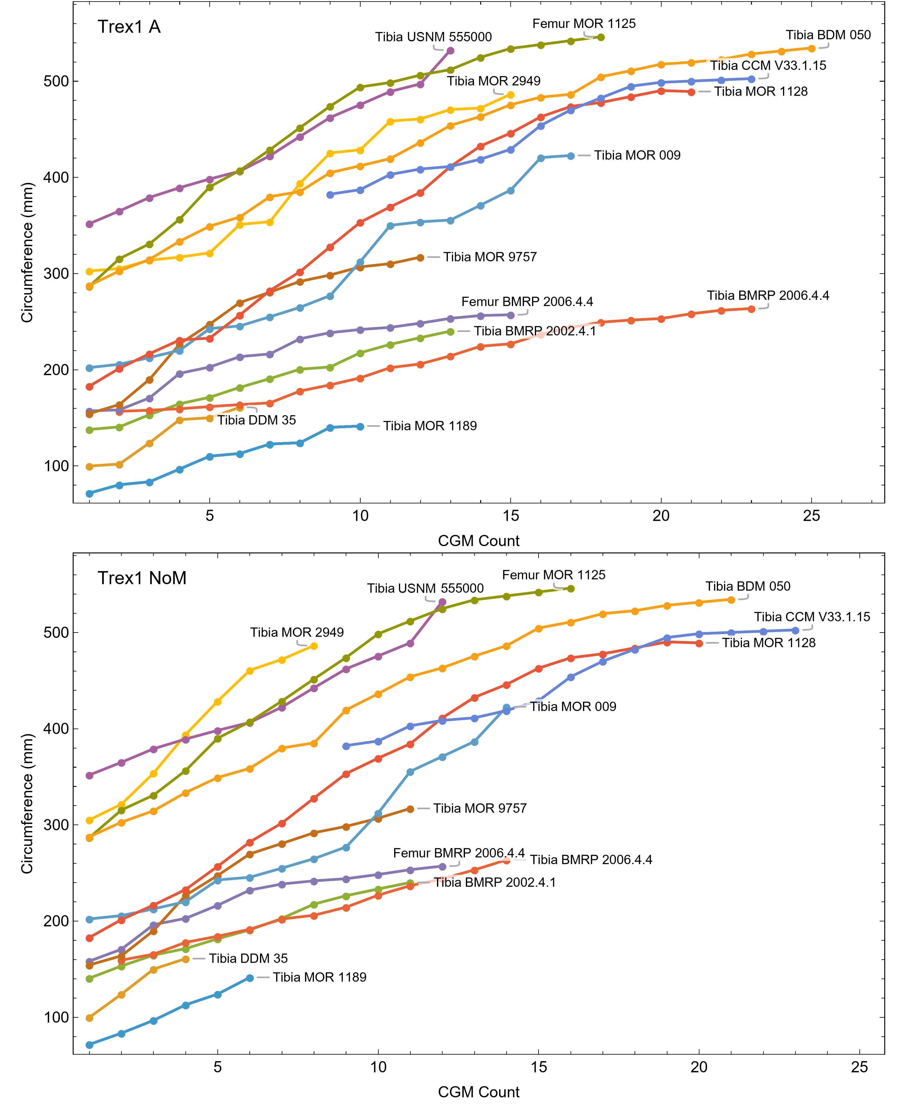 Individual Tyrannosaurus growth series for dataset Trex1, A and NoM variants.