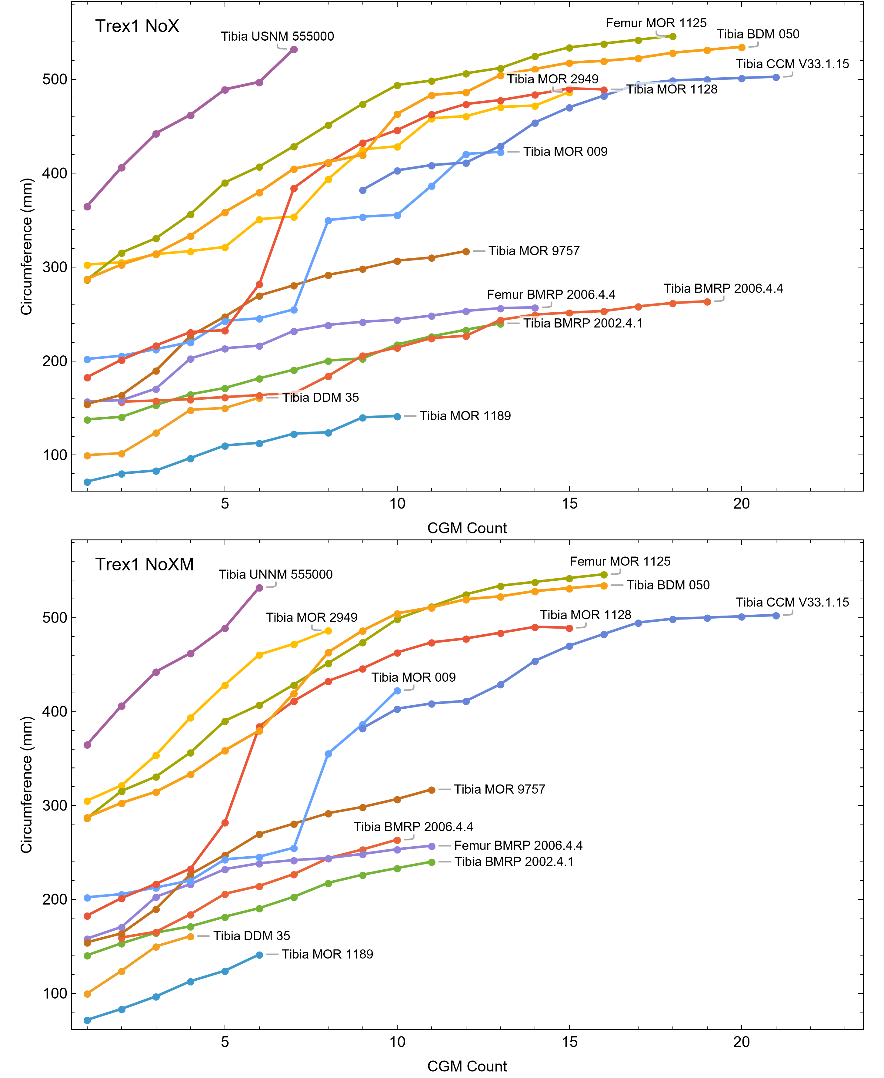Individual Tyrannosaurus growth series for dataset Trex1, NoX and NoXM variants.