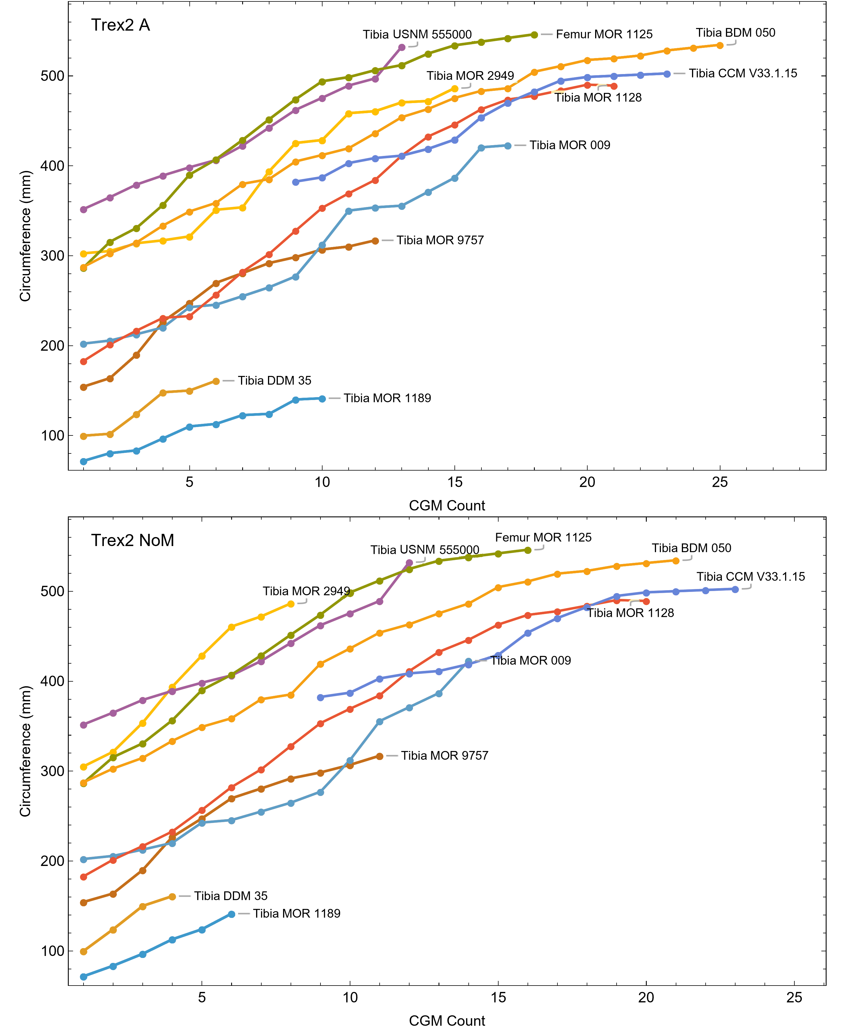 The femur and/or tibia histology of seventeen individuals in the Tyrannosaurus rex species complex contributed to qualitative assessments of life history. Unfortunately, the diaphyses of five specimens were too fragmentary (MOR 1156, MOR 1198, DDM 35.68) or taphonomically damaged post-burial (MOR 2970, MOR 9756) to accurately quantify CGM or circumferences from thin sections and were therefore omitted for modeling. However, the qualitative nature of these specimens is consistent with the others. The Wolfram Mathematica software package (Wolfram Research, Inc., 2024) was used to perform growth modeling using the twelve remaining individuals in the dataset which were represented by either a femur or tibia, and by both femur and tibia in the case of BMRP 2006.4.4.