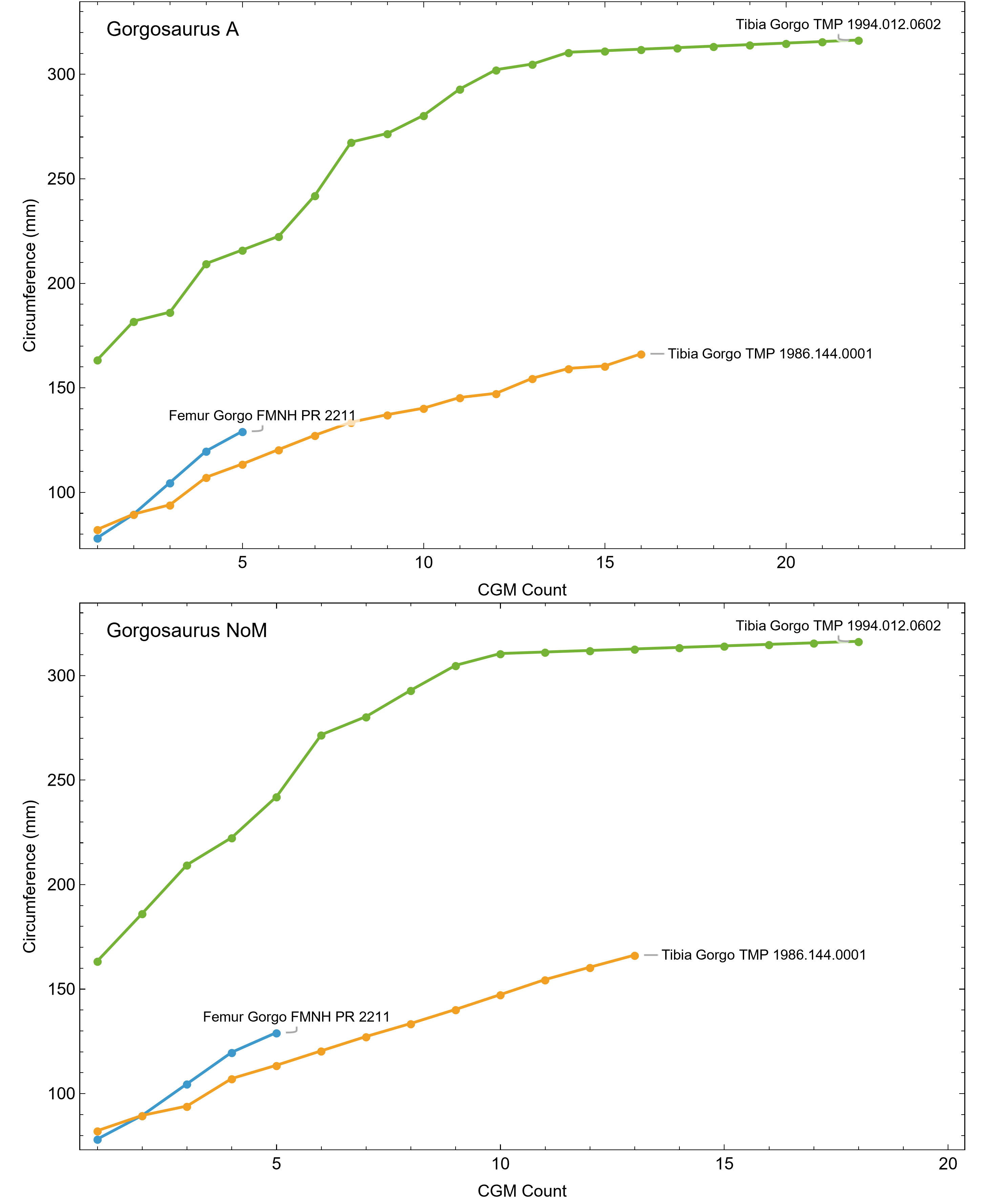 Individual Gorgosaurus libratus growth series, A and NoM variants.