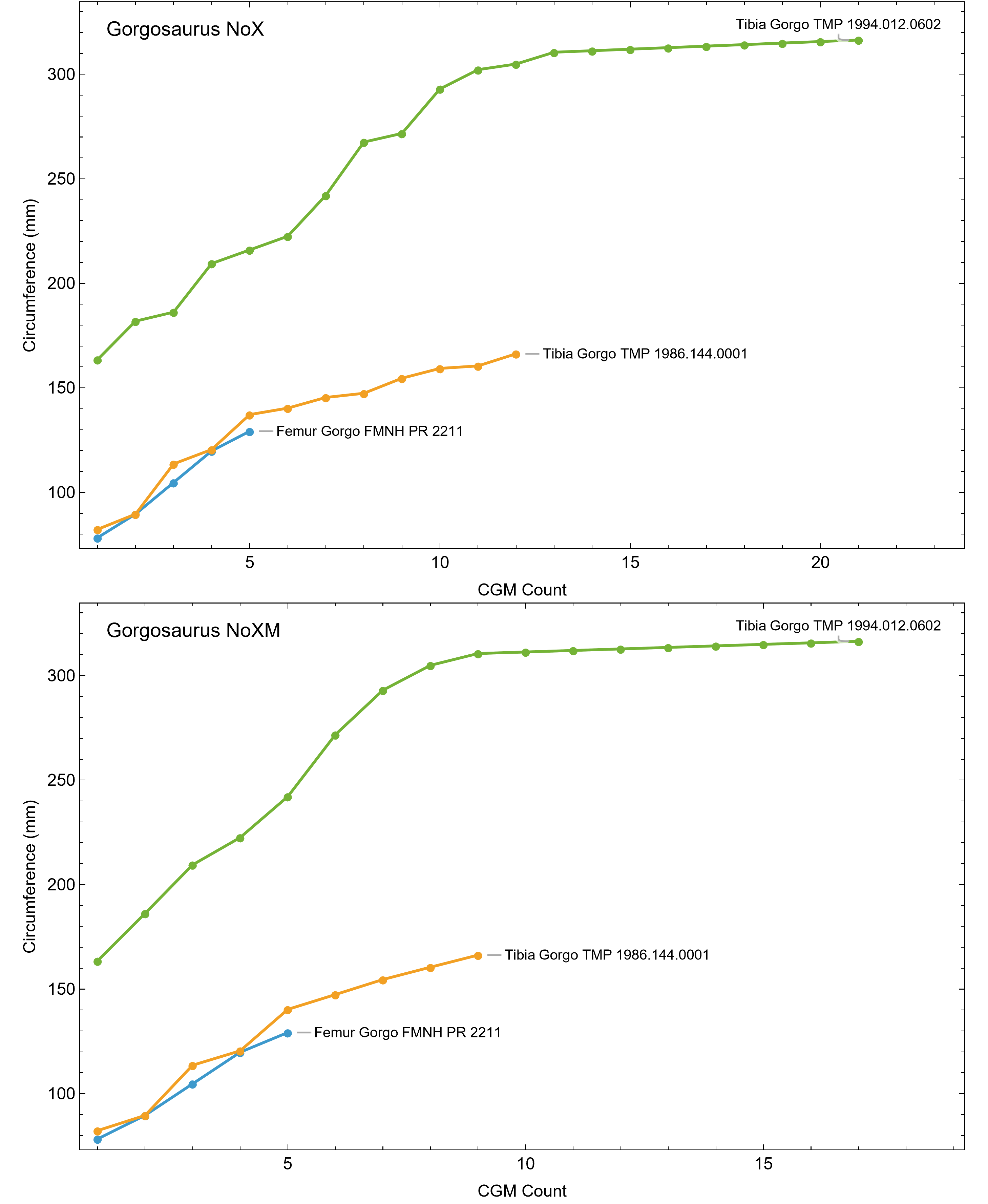 Their new specimen, NCSM 40000, is referred to Nanotyrannus lancencis, based on both anatomical evidence and the discovery of an EFS in the femur and tibia indicating that it, unlike the BMRP specimens, had reached skeletal maturity. Zanno & Napoli (2025) use femoral CGM measurements excluding multiplets and do not report XPL lines, thus their growth series would be considered a NoXM variant in our study. Due to several methodological differences, application of our modeling methods on this specimen, including the study of CGM variants, awaits further research.