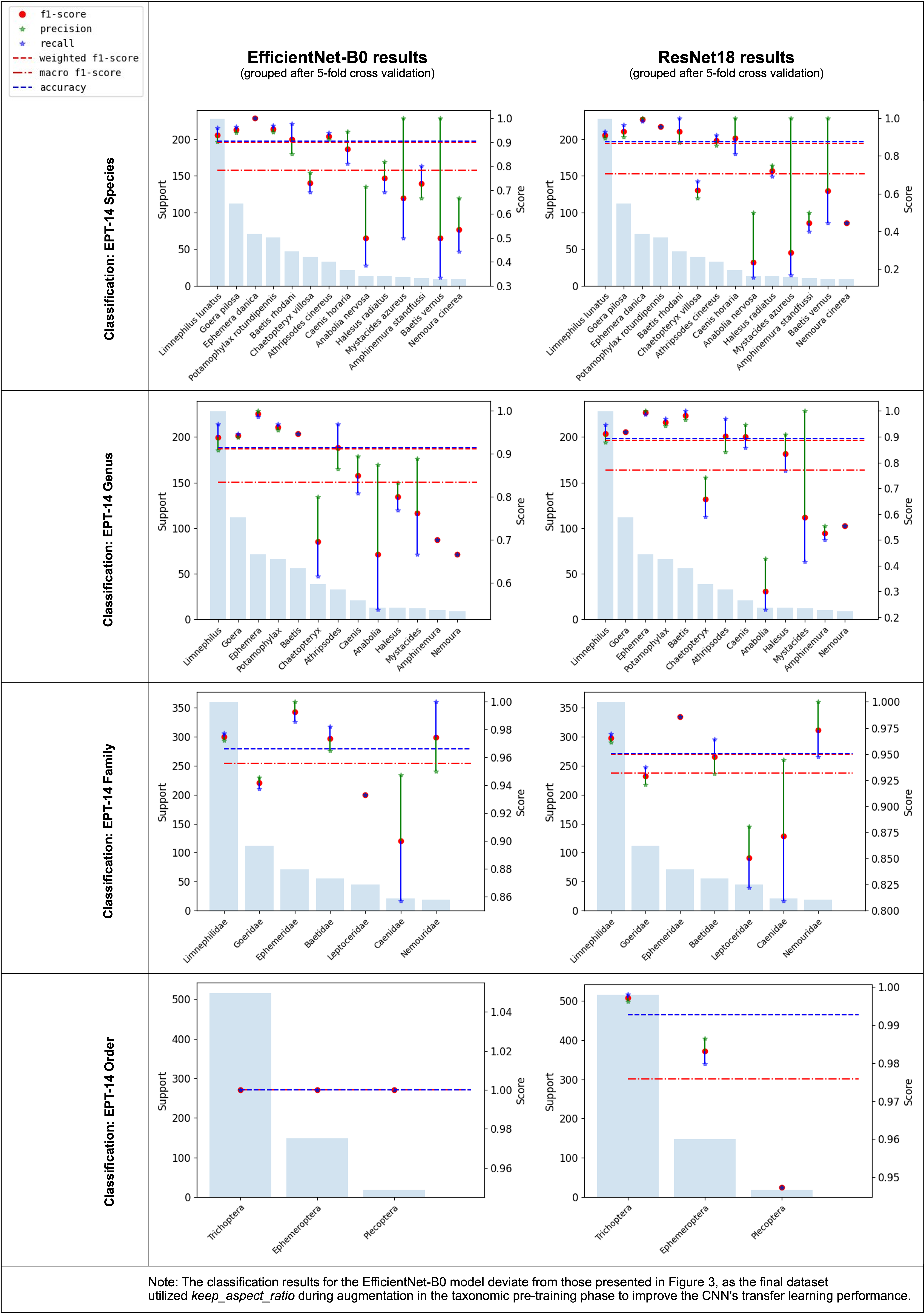 Overview over performance metrics from classification CNNs. using the EfficientNet-B0 (left) and ResNet18 (right) architecture targeting different taxonomic levels of the EPT-14 dataset