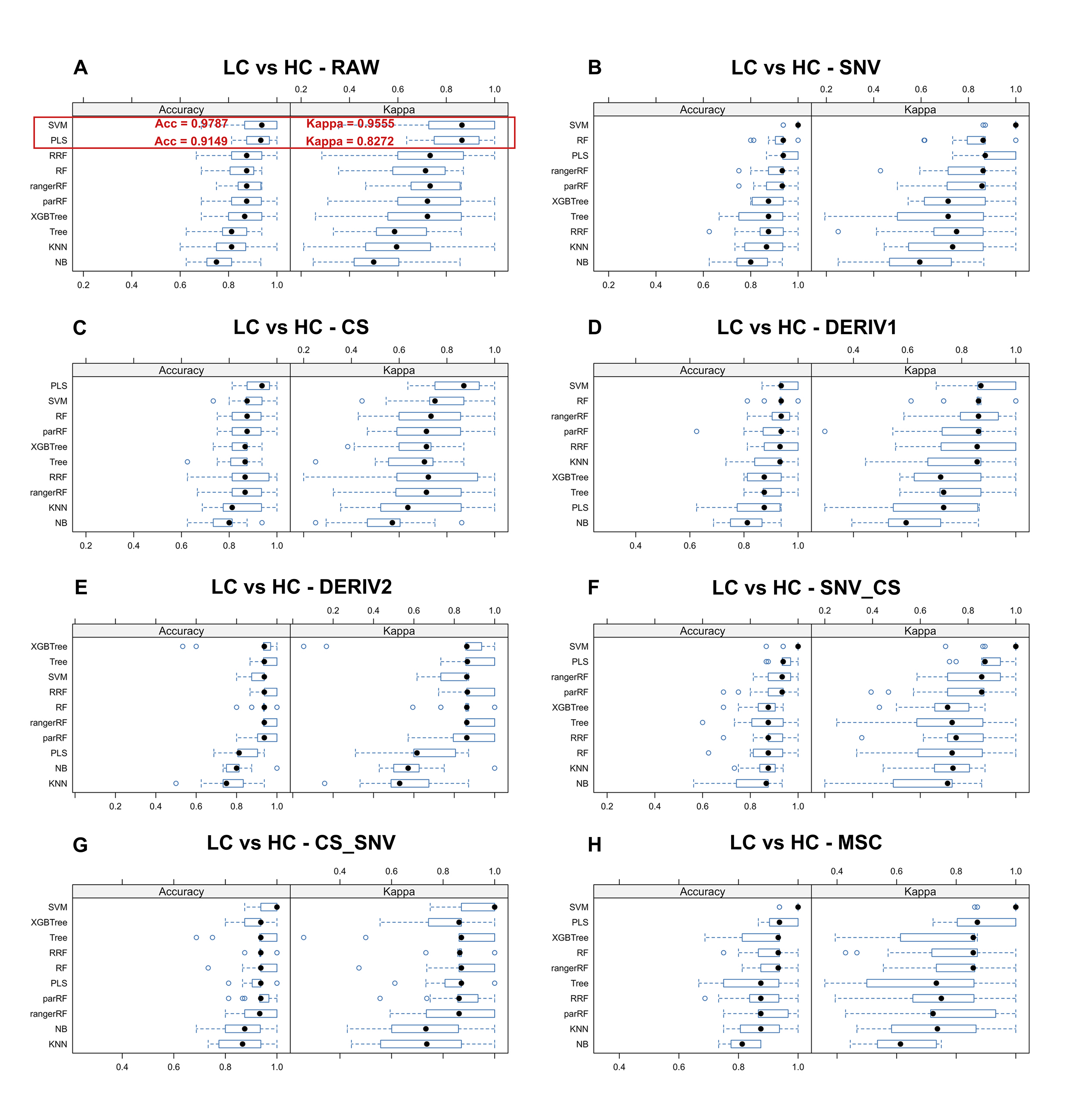 Incorporating 8 preprocessing methods, including the (A) raw data, (B) centering and scaling(CS), (C) second derivative processing, (D) centering and scaling and standard normal variate (CS_SNV), (E) standard normal variate (SNV), (F) first derivative processing, (G) standard normal variate and centering and scaling (SNV_CS), (H) multiplicative scatter correction (MSC), with 10 ML algorithms, each LC diagnostic model’s accuracy and kappa value distributions are visualized in A–H Whisker plots after 3-fold cross-validation repeated 5 times for resampling process.