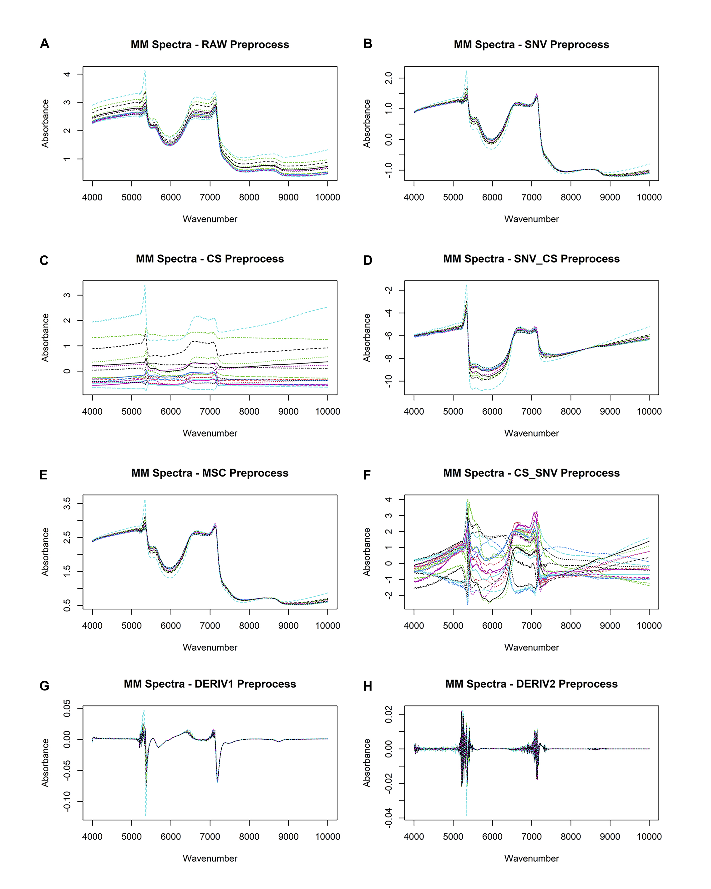 Preprocessing steps include: (a) raw data, (b) standard normal variate (SNV) normalization, (c) Centering and scaling (CS), (d) standard normal variate (SNV) normalization and then c entering and scaling (CS), (e)multiplicative scatter correction (MSC), (f) c entering and scaling (CS) and then standard normal variate (SNV) normalization, (g) 1st derivative and (h) 2nd derivative.