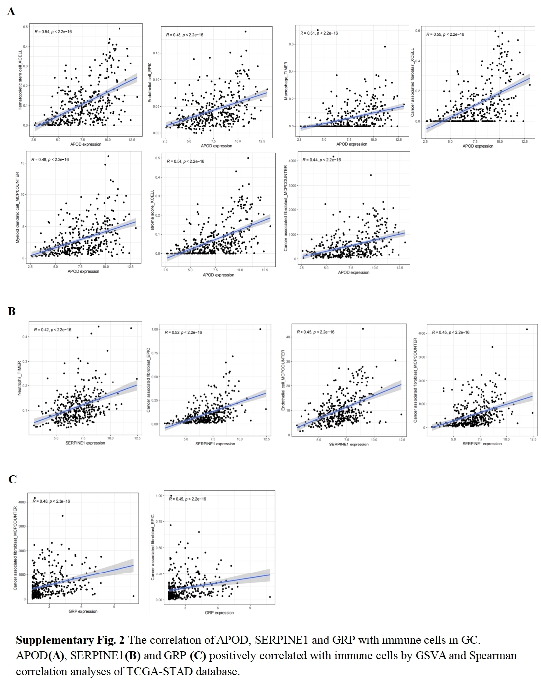 The correlation of APOD, SERPINE 1 and GRP with immune cells in GC