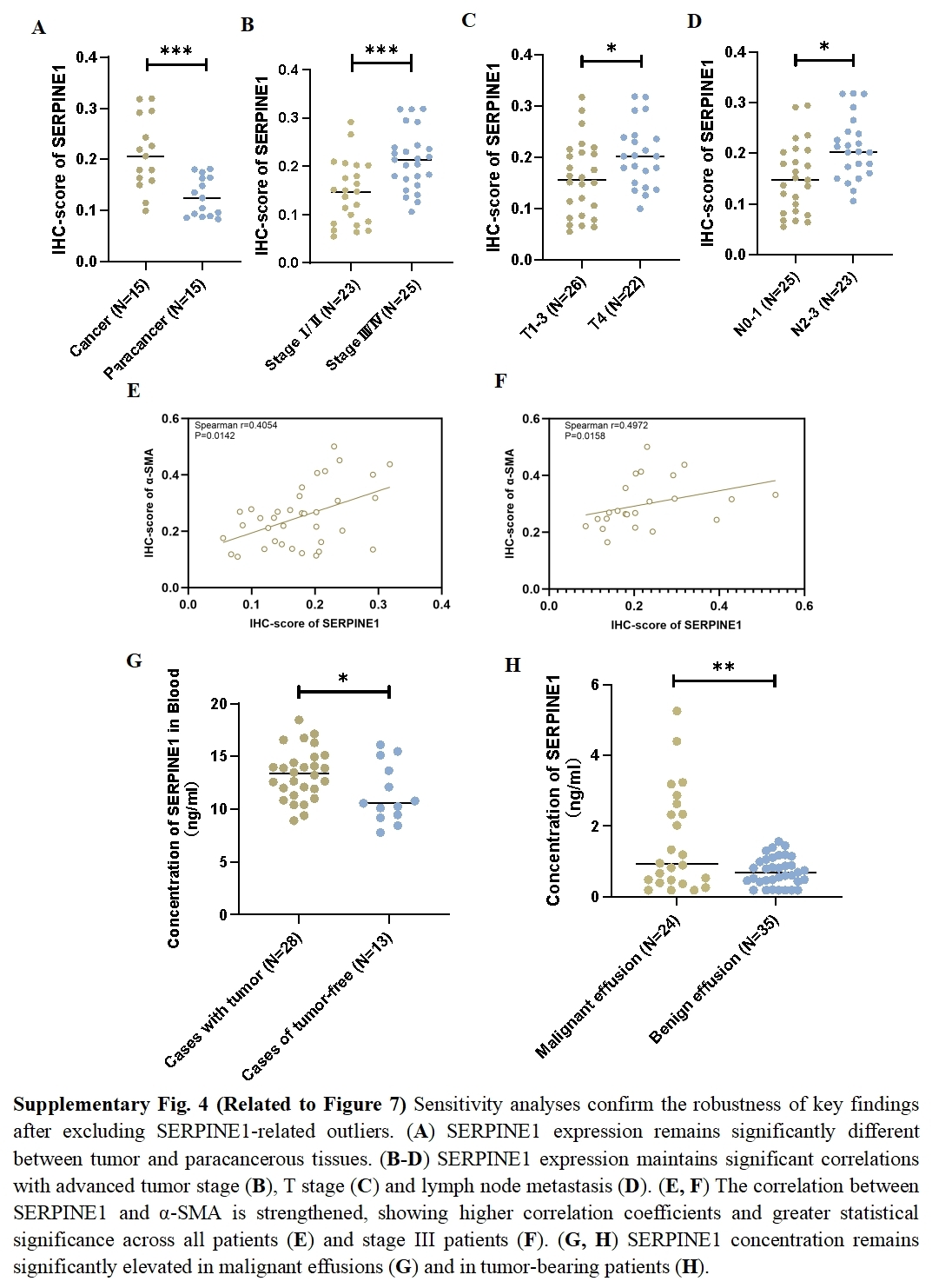 Data from clinical and cellular experiments are expressed as mean ± standard deviation (SD) and were analyzed using GraphPad Prism 10 software (San Diego, CA, USA). T test or Wilcoxon-test were used for comparisons between two groups, while one-way ANOVA was used for comparisons among multiple groups. The relationship between the IHC score of SERPINE1 and α-SMA was assessed using Spearman’s correlation analysis, considering the non-normal distribution of the variables. Outliers were determined by the box plot method or Grubbs test with an α-value ≤ 0.05 (3≥ n ≤30). All data were included and outliers were not excluded. Statistical significance was defined as a p-value below 0.05, with significance levels indicated as: * for p < 0.05, ** for p < 0.01, and *** for p < 0.001.