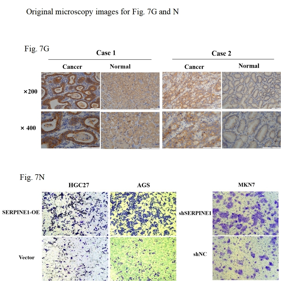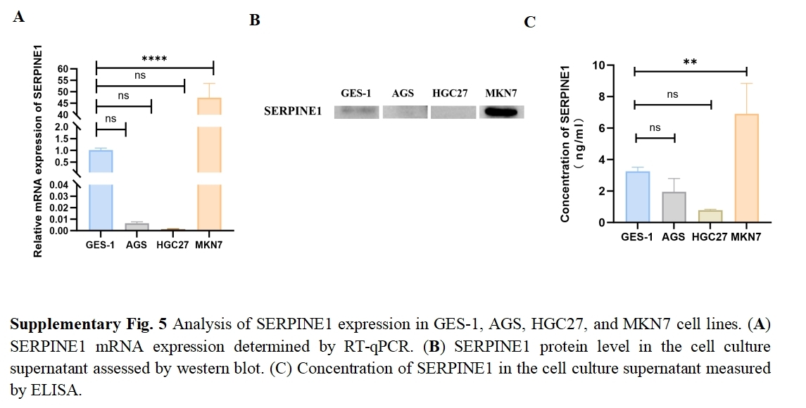We assessed the basal expression of SERPINE1 by RT-qPCR and measured its secretory levels in the cell culture supernatant by western blot and ELISA in the gastric cancer cell lines and normal gastric epithelial cells used in this study. The results confirmed that cell lines with high SERPINE1 expression secreted higher levels of the protein, while those with low expression exhibited lower secretory levels (Fig. S5). To elucidate SERPINE1’s functional role, we established genetic manipulation models based on its expression patterns across cell lines. Given the lower baseline expression of SERPINE1 in AGS and HGC27 cells and its higher expression in MKN7 cells, we generated SERPINE1-knockdown MKN7 cells (shSERPINE1) and SERPINE1-overexpressing AGS/HGC27 lines (SERPINE1-OE). Successful modulation was confirmed at both transcriptional and protein levels (Fig. 7K; Fig. S6). Functional assays demonstrated that SERPINE1 overexpression significantly enhanced colony formation capacity and transwell invasion, while SERPINE1 knockdown produced opposing effects (Figs. 7L–7O).