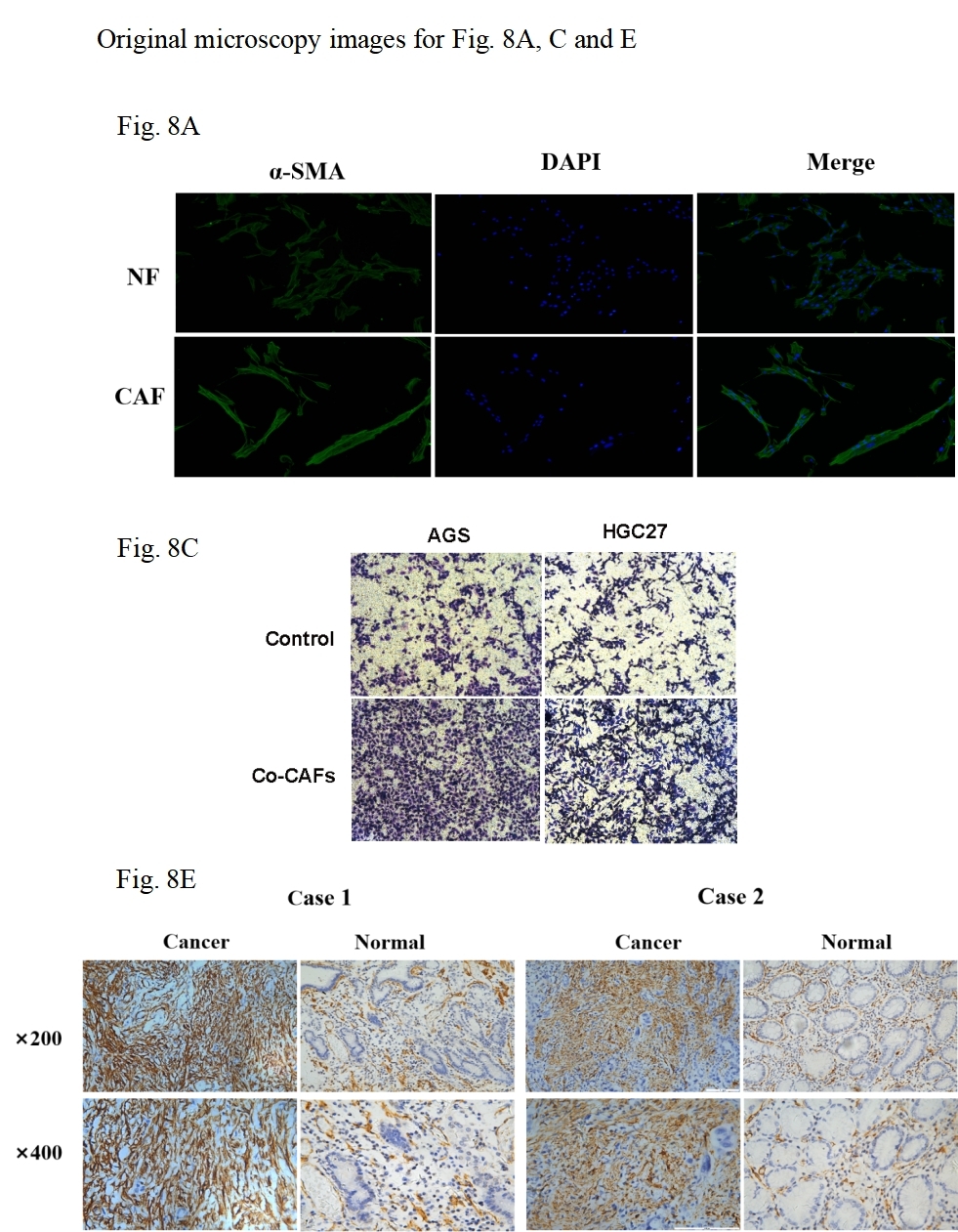 CAFs and NFs were isolated from surgically resected gastric cancer tissues and adjacent non-cancerous tissues, respectively. The tissues were minced and digested with 0.15% collagenase type I for 4–6 h. The resulting cell suspension was filtered and cultured in DMEM containing 20% FBS. The cells were further isolated and purified through differential enzymatic digestion using Accutase cell detachment solution (Gibco, Billings, MT, USA).