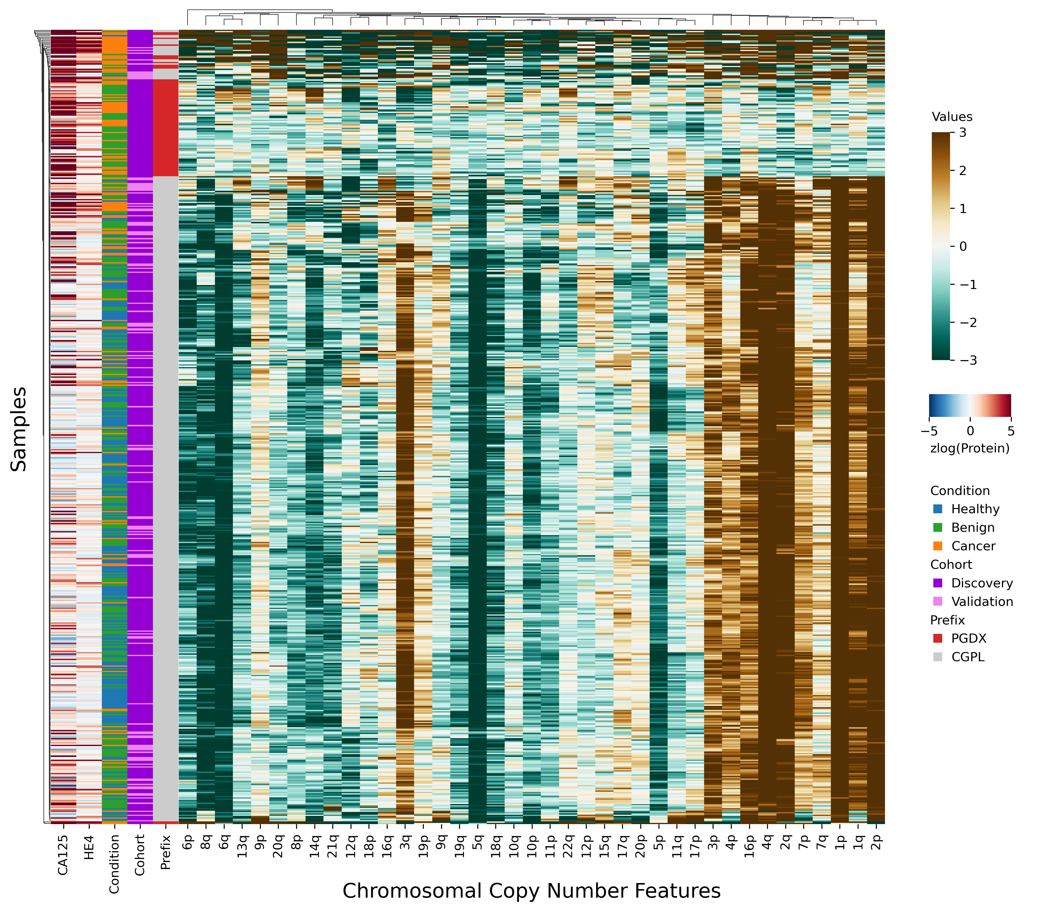 The samples from the DELFI-Pro dataset are shown here, with each row representing features from a single sample. For the proteins CA125 and HE4, we display the zlog-transformed values for each sample. Features are sorted such that the leftmost features are more affected by the batch effect. All features had values standardized here prior to display.Seeing the visually apparent differences in PGDX and CGPL samples within the copy number features, we sought to quantify the predictive value of the features absent this confounding factor, as well as the impact of the differences. Because the CGPL samples were 4.6 times more numerous than the PGDX samples, and the CGPL samples included all three of our conditions (healthy, benign, and cancer), we focused our analysis first on the CGPL samples.