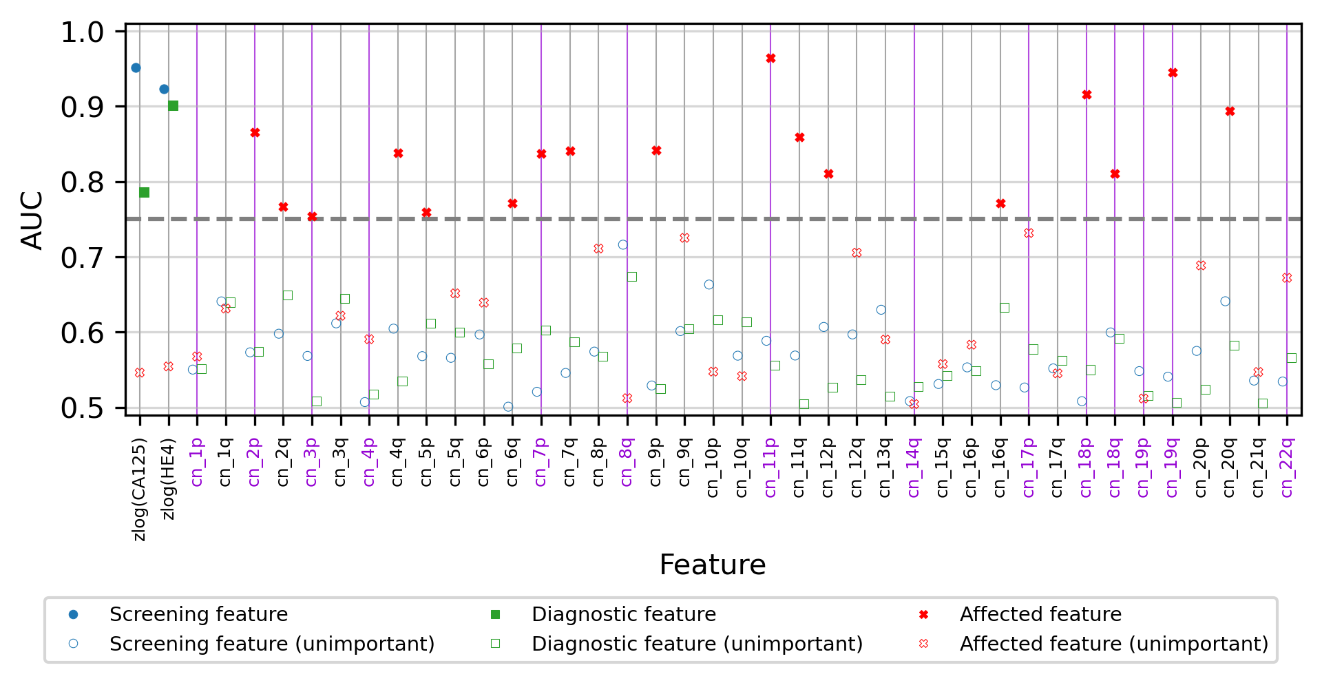 For each displayed feature, we analyzed the discovery cohort and computed three receiver operating characteristic (ROC) curves and measured the area under the curve (AUC). Two curves were calculated on CGPL-prefixed samples, measuring a feature’s association with cancer in a screening and a diagnostic context. The third curve was calculated on cancer samples only, and measured a feature’s association with the two different prefixes (CGPL and PGDX) to determine how affected a feature was by batch confounding. Features with a “cn_” prefix are copy number features, and those with a “zlog” prefix are the zlog-transformed protein concentrations; copy number features listed in the DELFI-Pro results as contributing to the DELFI-Pro screening model performance are highlighted in violet. We use an AUC threshold of 0.75 to separate features that are good predictors from those features that are less important; features described as “unimportant” in the figure are those with AUC values less than 0.75.