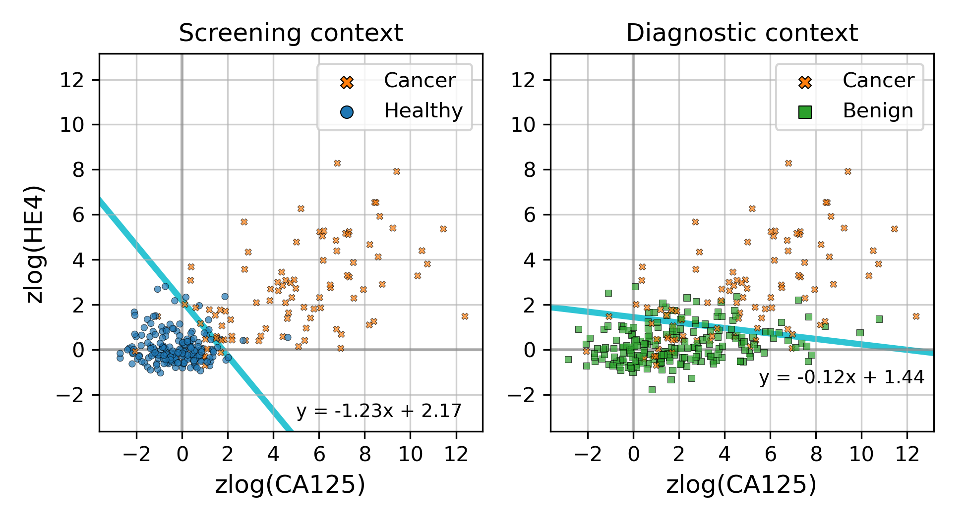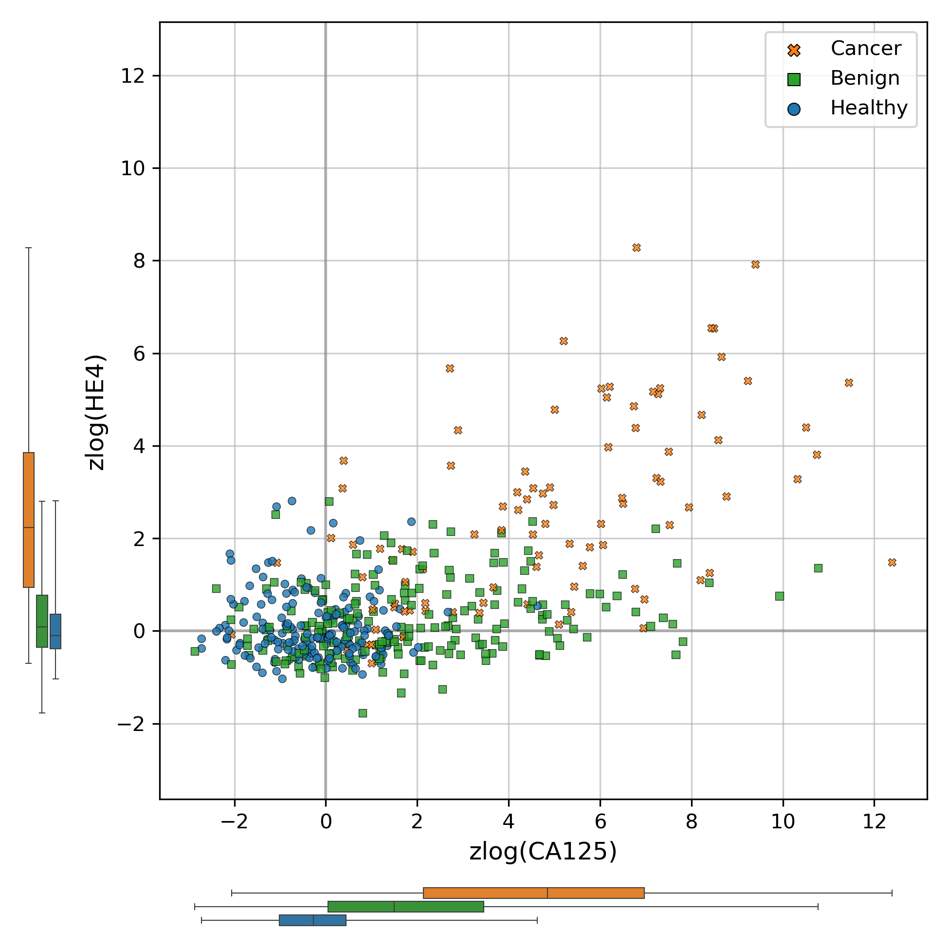 A common and important early step in machine learning with laboratory analytes is to use the zlog transformation (Al-Mekhlafi, Klawitter & Klawonn, 2024). This transformation compensates for the fact that the range of values from pathological samples can be an order of magnitude higher than that seen in healthy samples. The zlog transformation takes the logarithm of the input value so that the range of data is reduced, and also standardizes the result so that healthy data tends to be close to a value of zero. We applied this transformation to CA125 and HE4 values, using the zlog values for subsequent analyses instead of the original protein concentrations. In this zlog feature space, we can see that CA125 appears to distinguish between healthy and cancer samples well, but that HE4 may be needed to appropriately distinguish between benign masses and cancer samples (Fig. S3). The two zlog features are not strongly correlated, with a Pearson correlation coefficient of 0.57 in the discovery cohort.