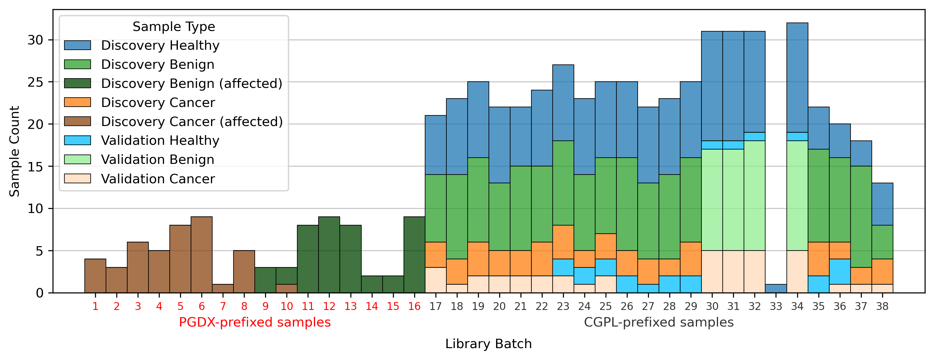 In their experimental design for the DELFI-Pro article, the authors noted that they took measures “to reduce the possibility that differences between patients with or without cancer were not due to batch variability”. Batch effects, a well-recognized issue in laboratory analyses (Yu et al., 2024), represent technical variations that correlate with the processing batches of samples, rather than underlying biological or scientific factors (Leek et al., 2010; Anderson-Trocmé et al., 2020). These confounding effects can significantly impact downstream analyses, potentially leading to overly optimistic results, even when cross-validation is employed (Soneson, Gerster & Delorenzi, 2014; Goh, Wang & Wong, 2017). Notably, batch effects are known to affect various aspects of nucleic acid processing projects, including GC-content bias (Teng & Irizarry, 2017), RNA transcript expression (Zhang, Parmigiani & Johnson, 2020), and copy number (Scharpf et al., 2011; Cristiano et al., 2020).