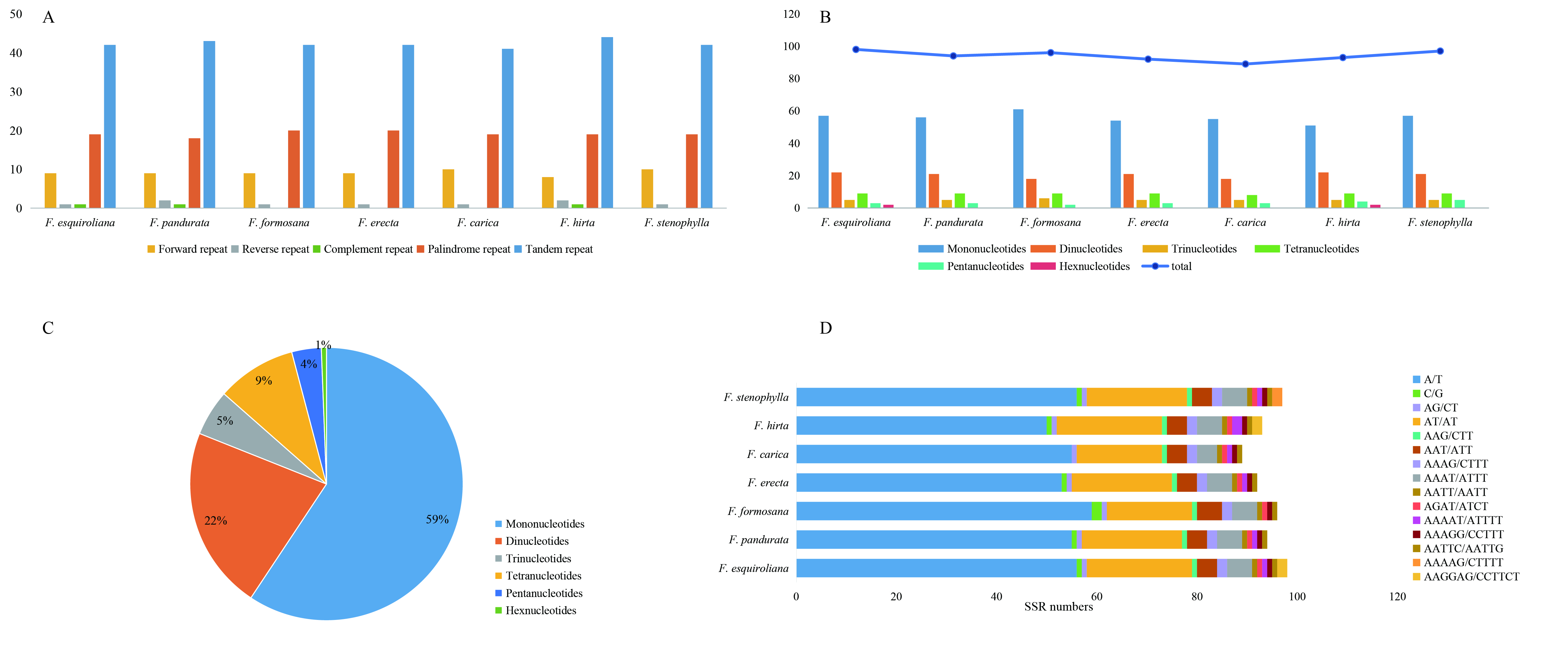 (A) The number of Dispersed repeat and Tandem repeat; (B) Number of various SSR repeat types; (C) The proportion of SSR repeat types across all seven species; (D) Number of SSRs in each species.