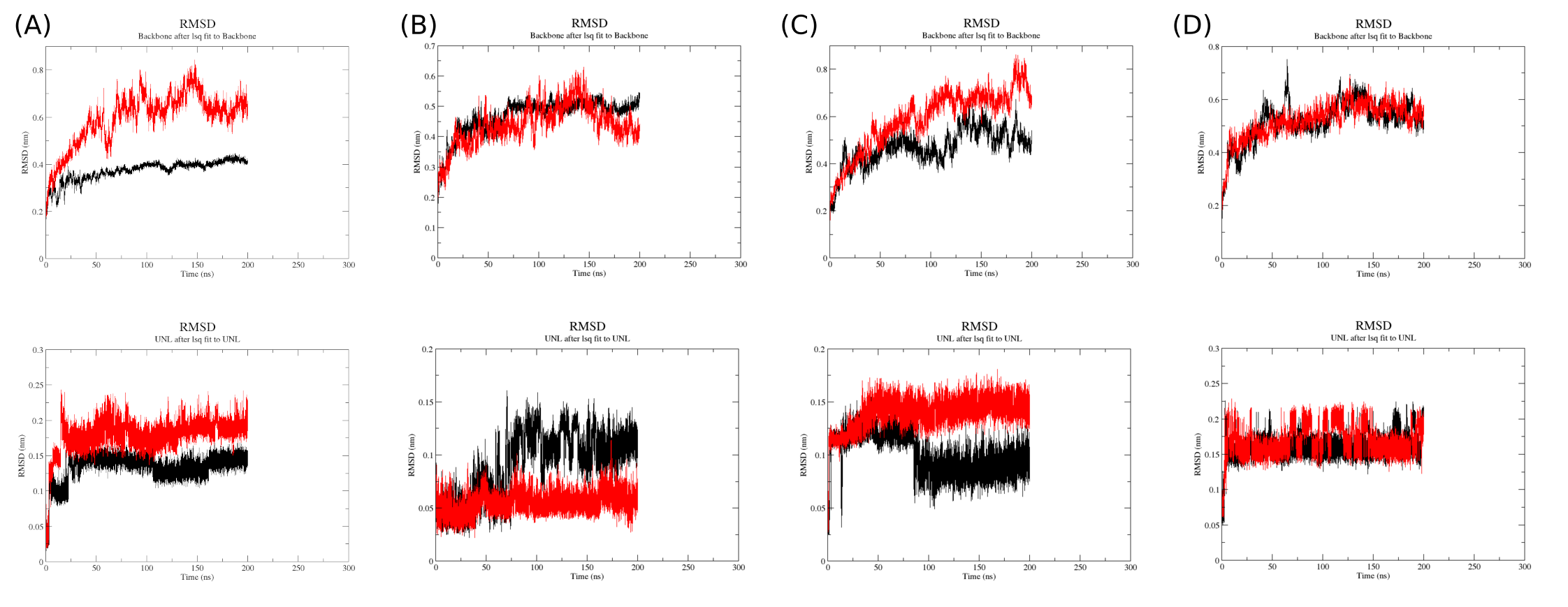 (A–D) Trajectories from two independent replicate simulations are overlaid for each system from Ligand 1 to Ligand 4 complex (replicate 1: red; replicate 2: black), demonstrating the convergence of protein compactness dynamics across runs. Rg values (nm) were calculated for all backbone atoms at 100-ps intervals over the full simulation timecourse.