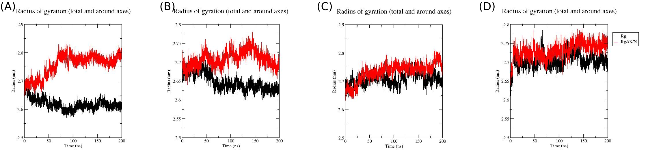 Radius of gyration (Rg) analysis for four molecular dynamics (MD) systems.