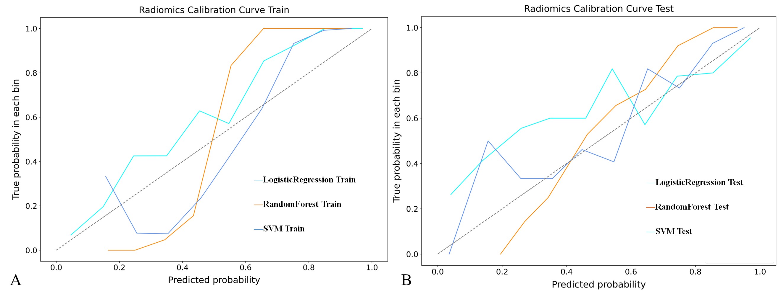 A total of 118 radiomics features were used to construct three models that demonstrated good performance. In the training and test cohorts, the SVM model achieved area under the curves (AUCs) of 0.917 and 0.858, and F1 scores of 0.808 and 0.755, respectively. The RF model showed the highest predictive performance with AUCs of 0.996 and 0.824, and F1 scores of 0.982 and 0.832. The LR model achieved AUCs of 0.927 and 0.808, and F1 scores of 0.867 and 0.747.