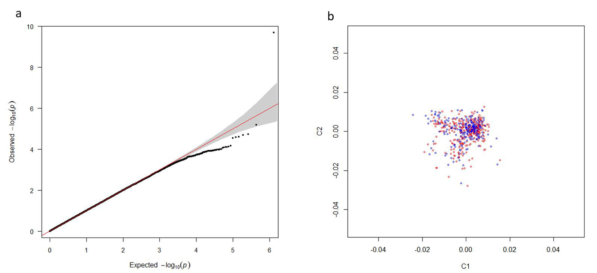 As shown in the Q-Q plot (Fig. S1A), the genome inflation factor (λ) was 1.02, indicating a lower possibility of population stratification. PCA analysis indicated that all subjects were genetically well-matched with minimal evidence of population stratification (Fig. S1B). After quality control, 606,254 SNPs were retained in the severe versus mild AIS association analysis.