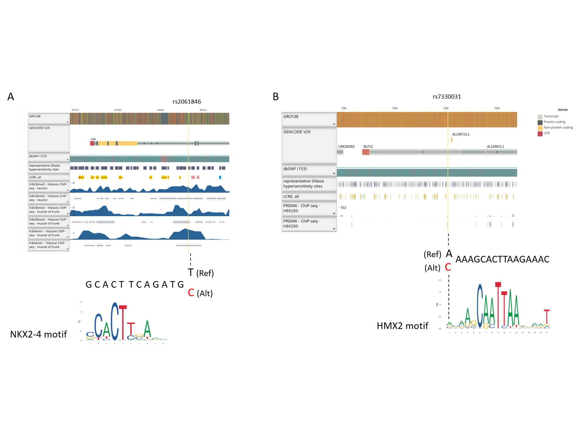 (A) rs2061846 resides in an intronic region of GAK characterized by enhancer-associated histone modifications (H3K36me3, H3K4me1), predicted NKX2 transcription factor binding, and accessible chromatin signals. (B) rs7330031 is located within an intronic regulatory element of KLF12, enriched for PRDM6-associated marks and overlapping a predicted HMX2 transcription factor binding motif.