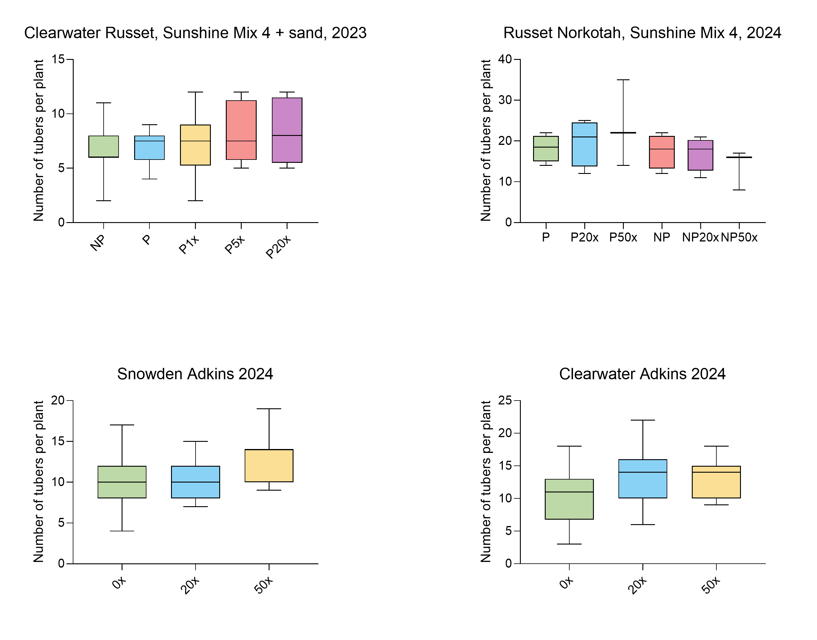 | Clearwater Russet | Sunshine Mix#4, sand (4:1) | 24 April | 6 May (<10%) 15 May (100%) |