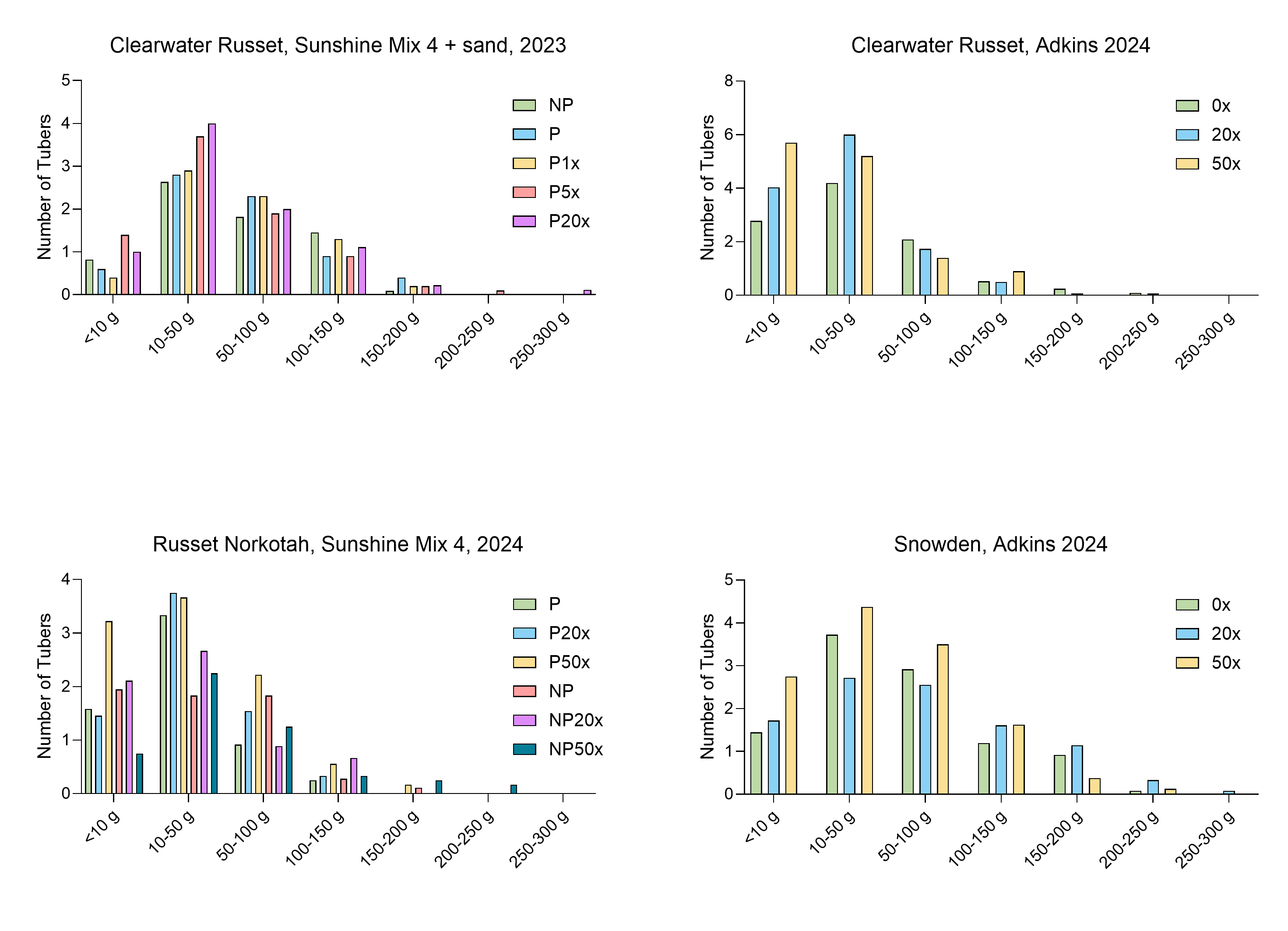 In spring/summer 2024, we grew two potato varieties in Adkins soil collected from the lower Columbia Basin in Oregon. This soil type is representative of the type of soil where potatoes are grown commercially in the Pacific Northwest. Soil thiamin supplementation up to 50X had no effect on total tuber yield, the number of tubers per plant and tuber weight distribution of either variety (Table 2, Figs. S2 and S3). The highest thiamin concentration decreased specific gravity in Snowden, but not in Clearwater Russet (Fig. S4).