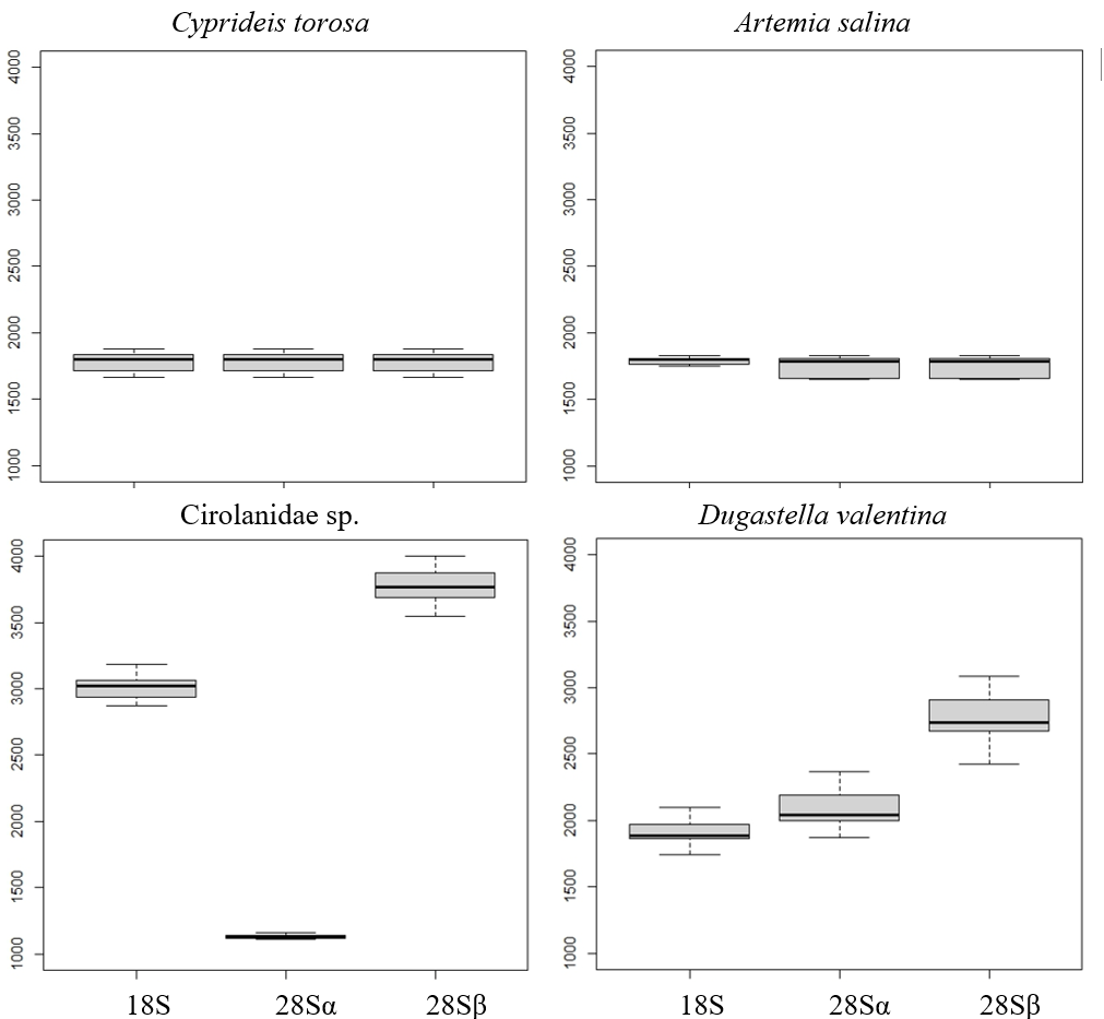 We analyzed RNA profiles for all species (Table 1). Peaks were assigned to 28S and 18S fragments by estimating gene lengths from BLAST matches of complete rRNA sequences from related species (almost all of them are related to our taxa at the suborder down to the genus level) against reference genomes (e.g., Asellus aquaticus, Trachelipus rathkii, Halocaridina rubra, Gammarus roeselii, Artemia franciscana, Triops longicaudatus, Cyprideis torosa). Gene size was computed as end–start of the match, and peaks were assigned accordingly (full or partial gene). In R, we calculated the mean and SD of major-peak sizes per species and plotted boxplots (median and IQR) for representative species of each main group (i.e., Branchiopoda, Malacostraca, and Oligostraca).