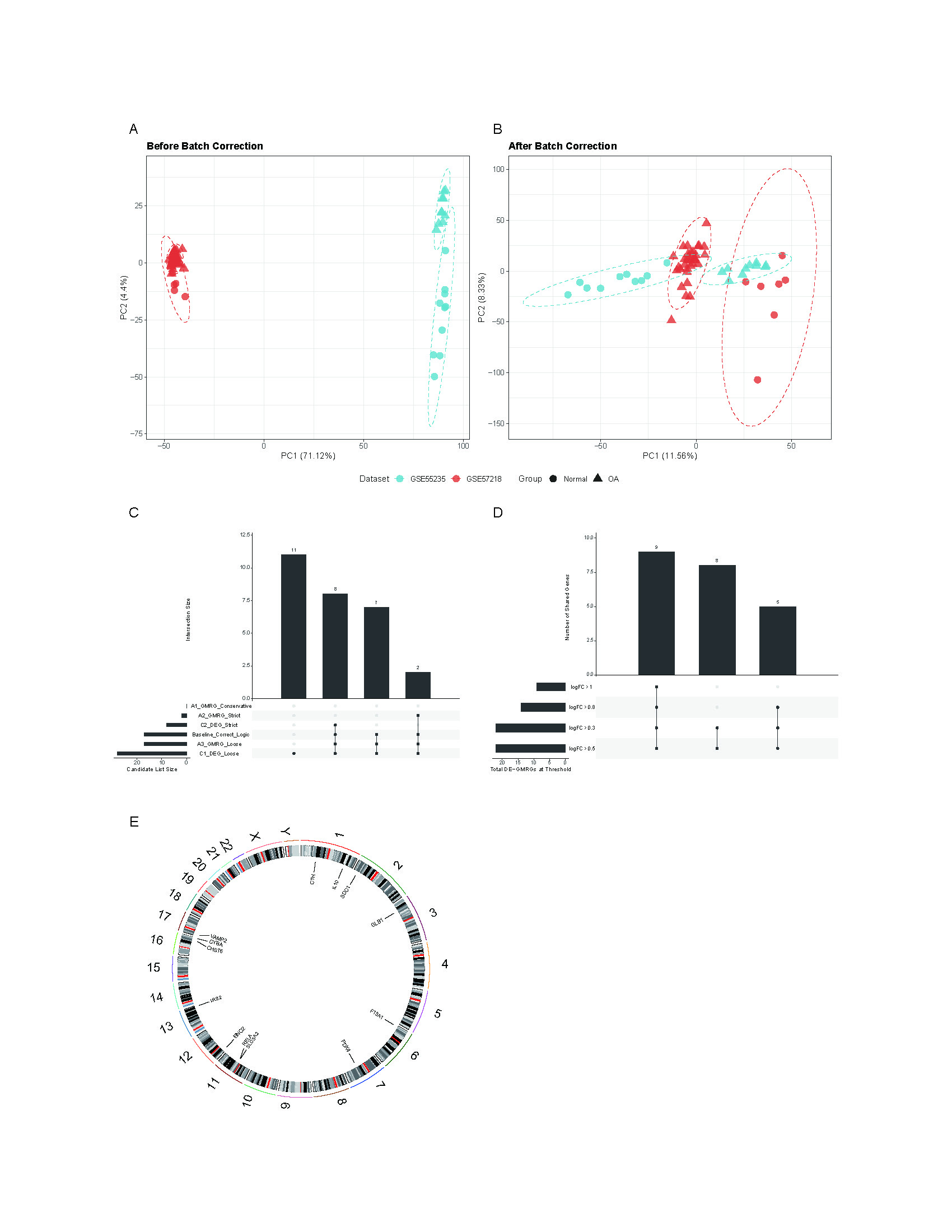 (A–B) PCA plots showing sample distributions in GSE57218 and GSE55235 before (A) and after (B) ComBat batch correction. (C) Upset plot of DE-GMRGs identified using five gene-set definition strategies. (D) Upset plot showing shared DE-GMRGs under four |log 10 FC| thresholds. (E) Circular map showing chromosomal localization of F13A1, IRS2, and RELA.