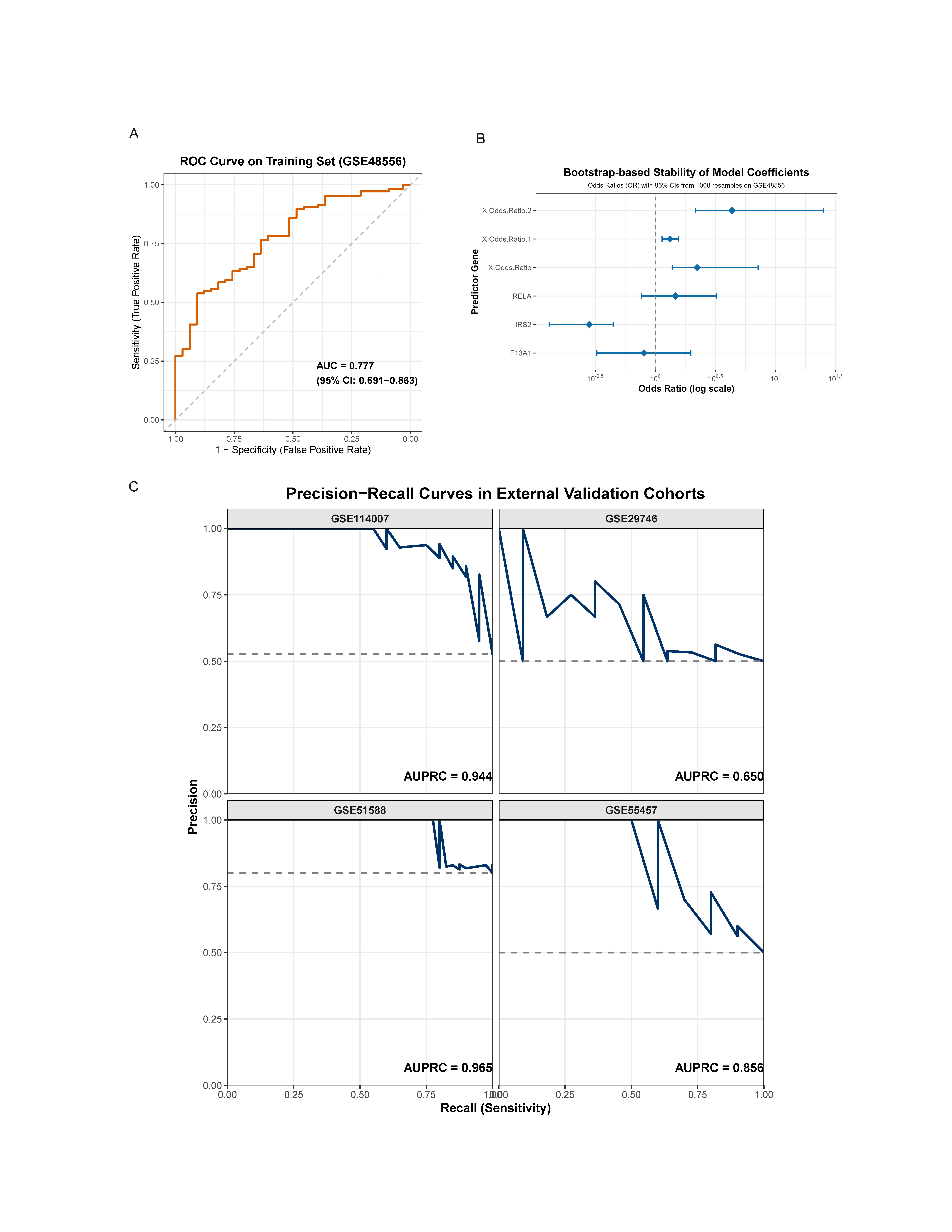 (A) ROC curve in the training dataset (GSE48556). (B) Bootstrap-based forest plot (1,000 resamples) showing coefficient stability (ORs with 95% CIs). (C) Precision–recall curves (AUPRC) for validation cohorts (GSE51588, GSE55457, GSE114007, GSE29746).