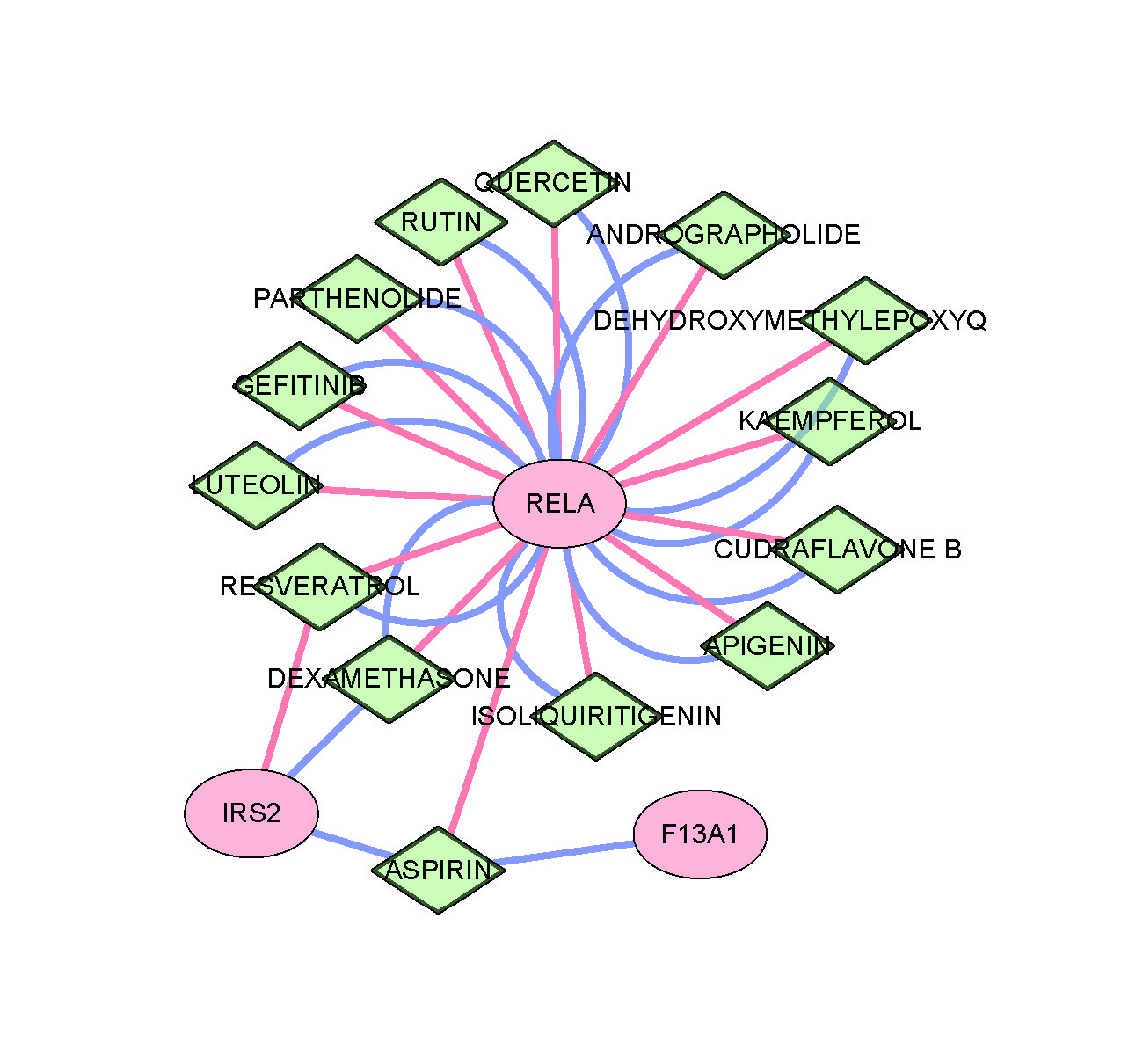 Drug–gene interaction network showing predicted therapeutic compounds (green diamonds) and their interactions with the core genes (pink ovals).