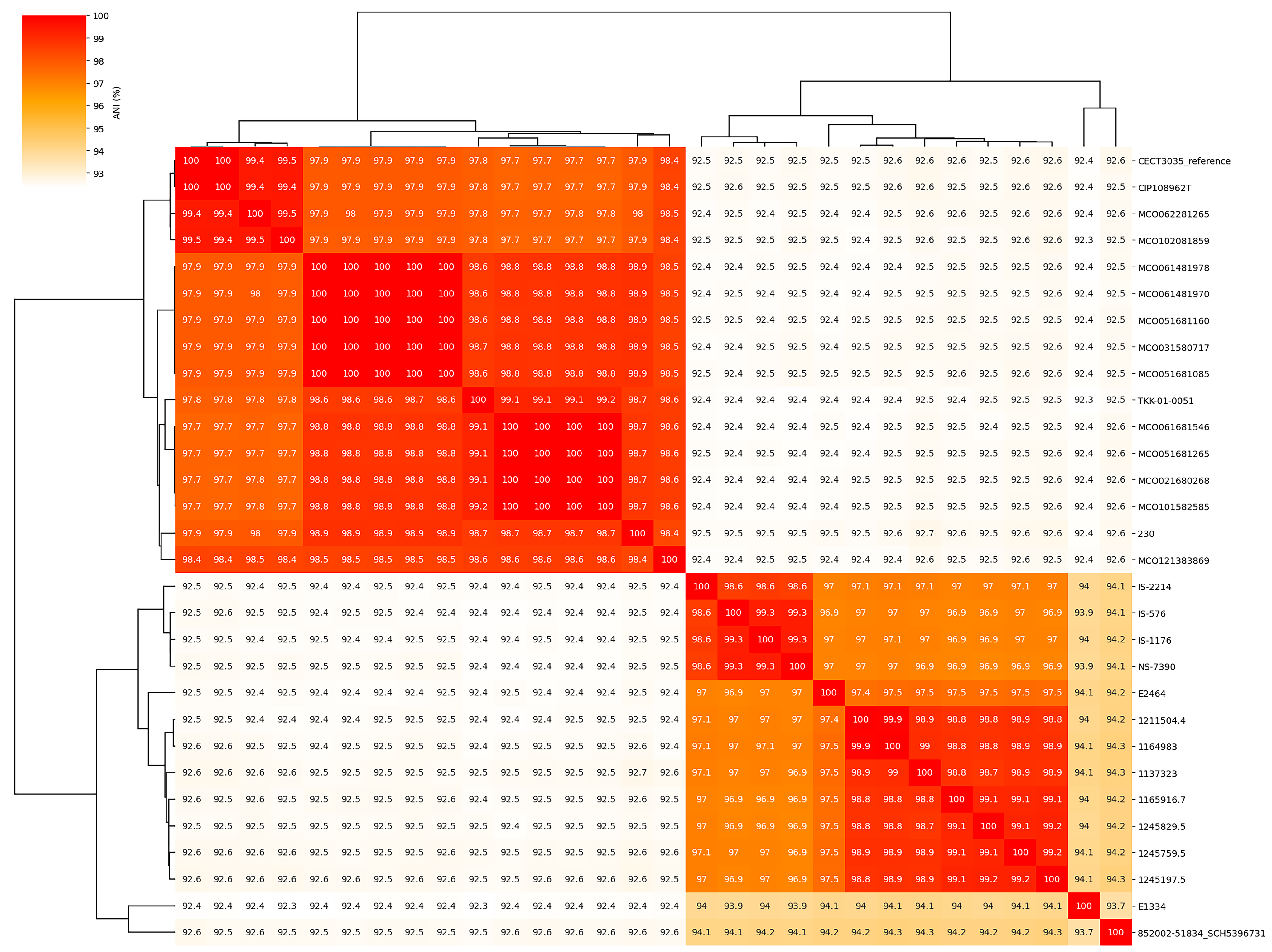 ANI percentages are illustrated using a color gradient from white (lower similarity) to red (higher similarity).