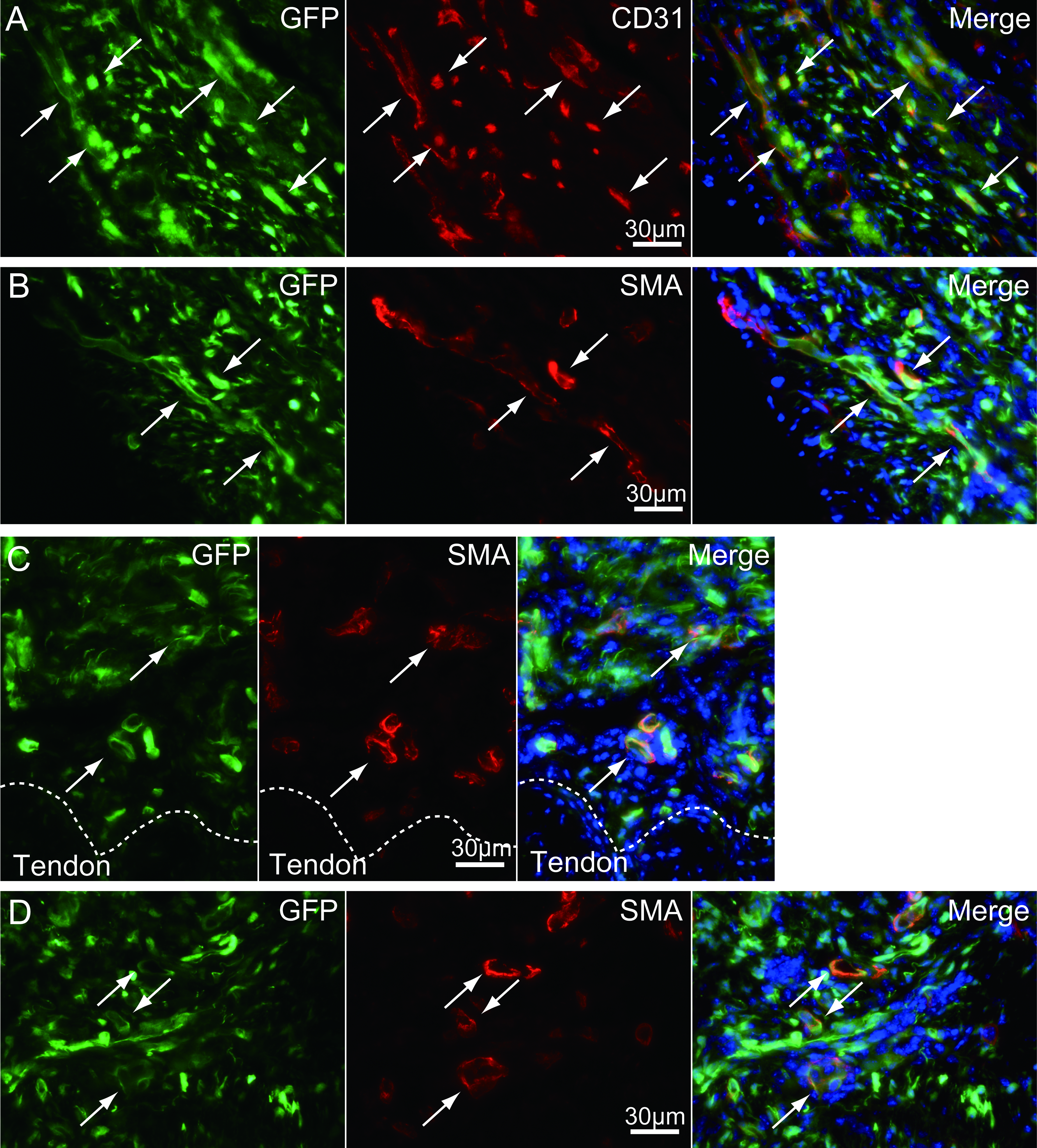 Higher magnification photographs, showing the GFP+/CD31+ cells and/or GFP+/SMA+ (anti-smooth muscle actin) cells