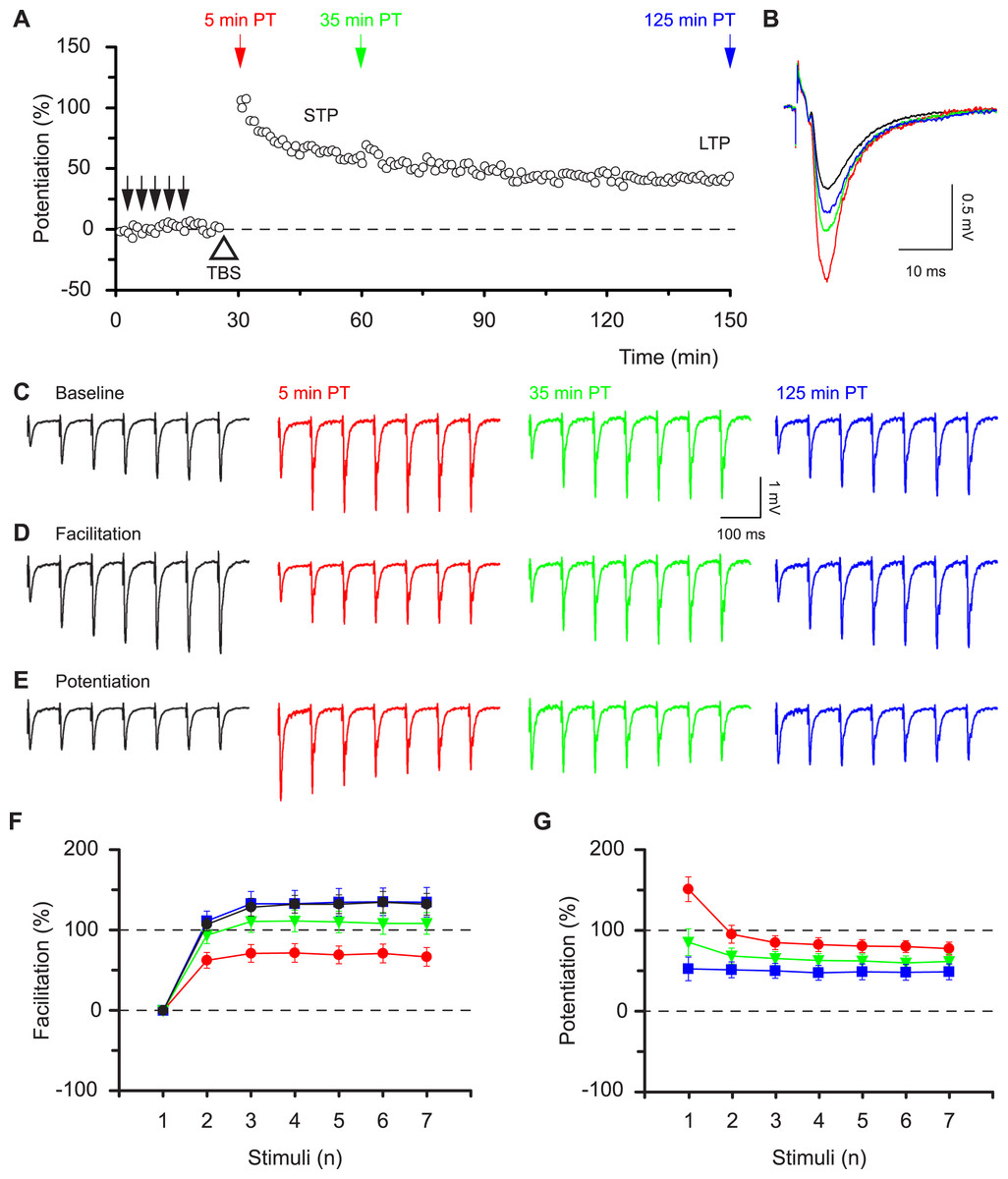 (A) Potentiation, induced by theta-burst stimulation (TBS, open triangle), consisted of a declining phase (STP) and a sustained phase (LTP). Brief bursts (7 stimuli, 12.5 Hz) were applied at times indicated by the coloured arrows before (black) and at various times post-tetanus (PT, red, green and blue). Results, in this and the following figures, are colour-coded according to the arrows. (B) Representative f-EPSPs during low frequency transmission before and after the induction of potentiation. (C–E) Representative f-EPSPs during the bursts plotted in absolute values (C), normalised to the first response in each burst, i.e. facilitation (D) or normalised to the corresponding response in the baseline, i.e. potentiation (E). F & G show how facilitation (F) and potentiation (G) alter depending on the time after TBS (mean ± S.E.M., n = 12).The differential effects of STP and LTP on responses during bursts are demonstrated by potentiation plots, which express the size of each response in the post-induction burst relative to the corresponding response in the baseline burst (Fig. 1E). The analysis of the first response in a burst is equivalent to the conventional LTP analysis of single evoked responses. However, potentiation plots permit quantitative assessment of whether all responses in a burst are potentiated equally. Notably, the initial response during the STP phase showed a much lager initial potentiation and a much greater response decrement with time, compared to the subsequent responses within the bursts (Figs. 1E and 1G). The level of potentiation of the first and seventh responses expressed relative to their respective baseline responses was, respectively, 151 ± 16% and 78 ± 8% (P < 0.001, paired t test) at 5 min post induction compared with 53 ± 15% and 49 ± 10% (P = 0.6) at 125 min post induction. Thus the effects of STP on responses during bursts are nonlinear whereas a linear amplification is achieved by LTP. These results show that STP and LTP differentially affect the ability of synapses to respond to high frequency bursts depending on the time following induction.